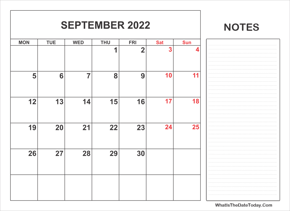 Another 2022 Printable September Calendar with Notes space. This calendar start with monday include weekend highlight and notes space at the right of it.