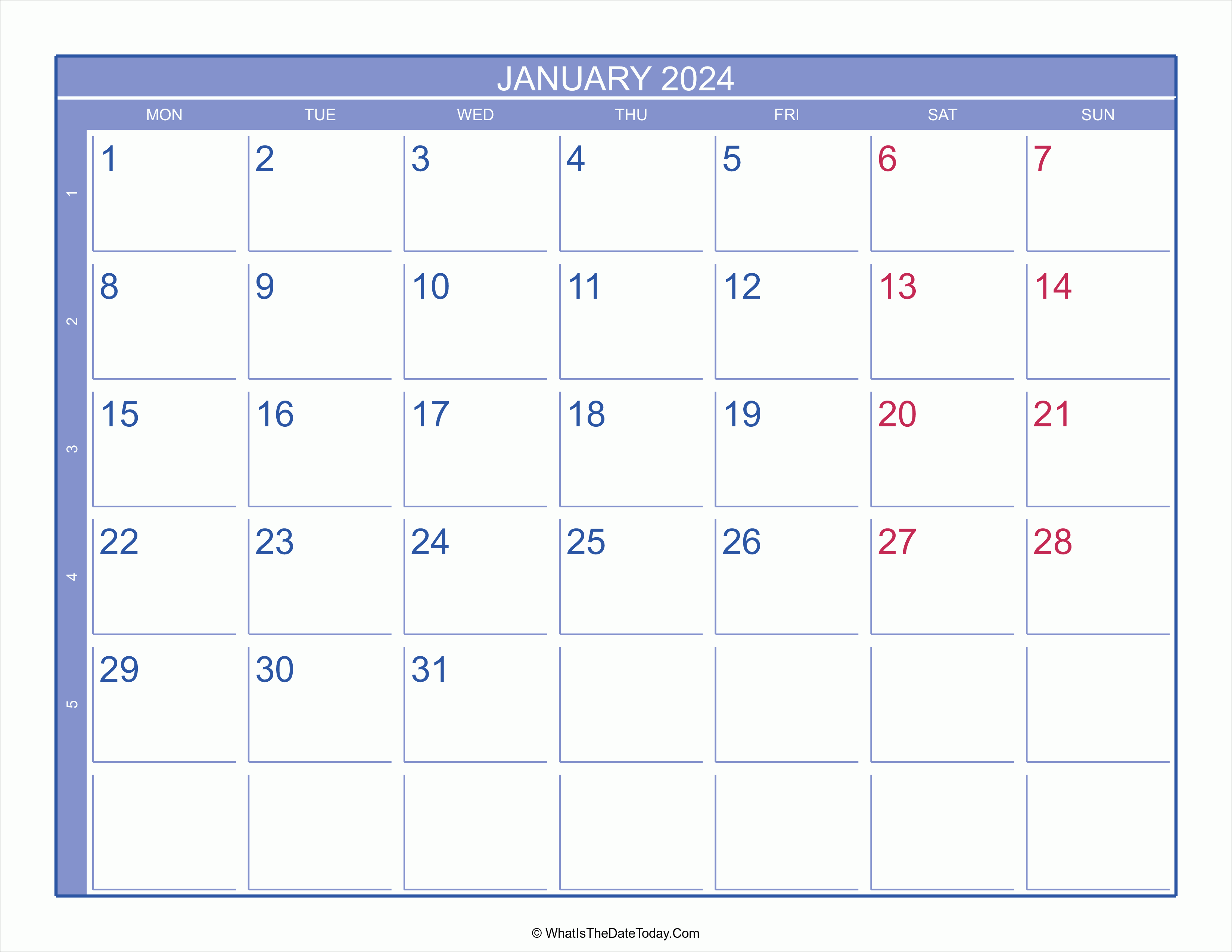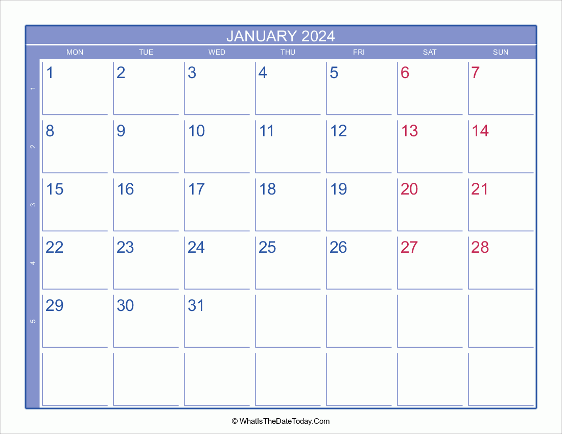 This is 2024 January Calendar with Week Numbers in blue color. It also have weekend highlight with red color. Free to download and print!
