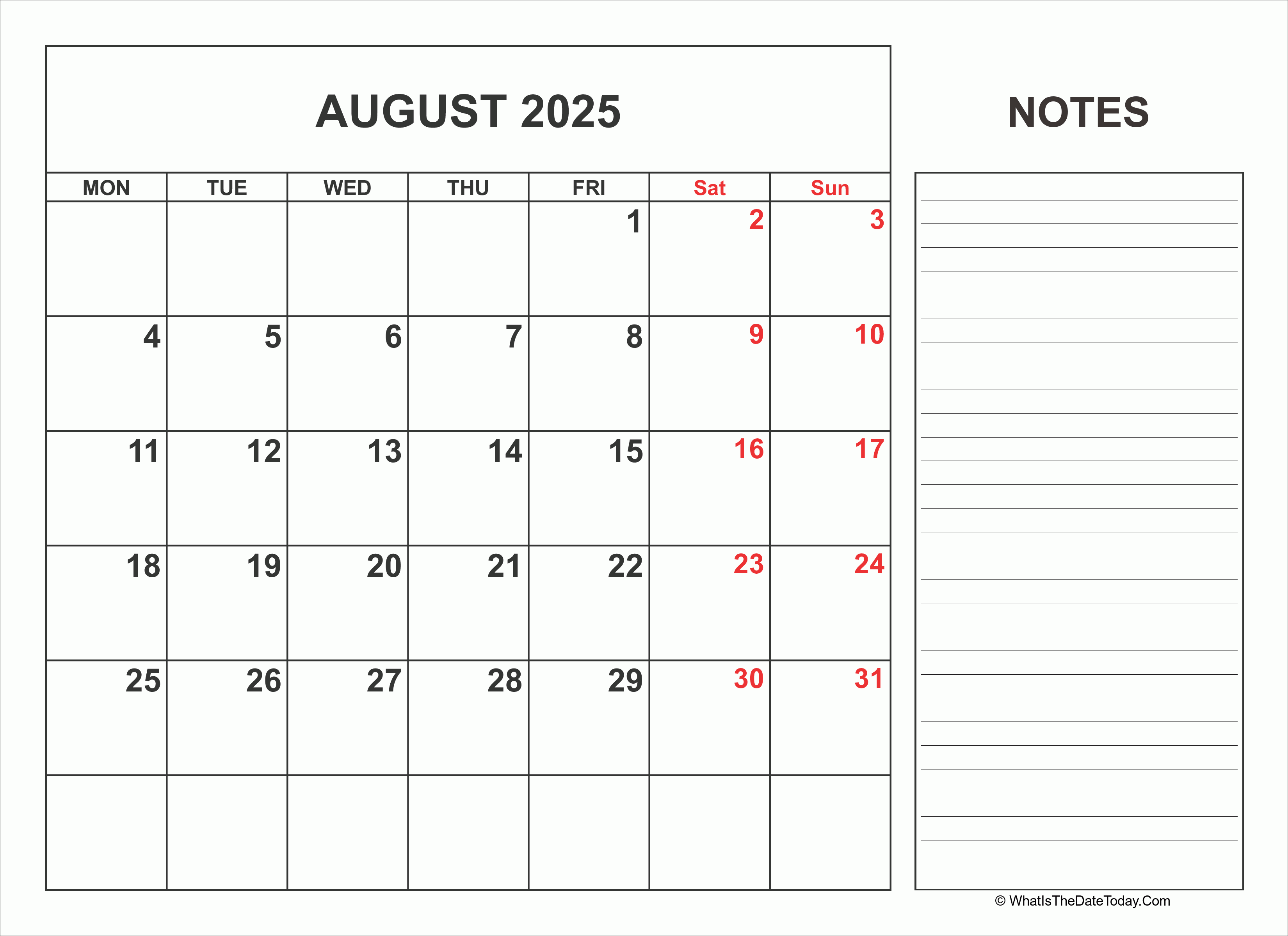 Another 2025 Printable August Calendar with Notes space. This calendar start with monday include weekend highlight and notes space at the right of it.