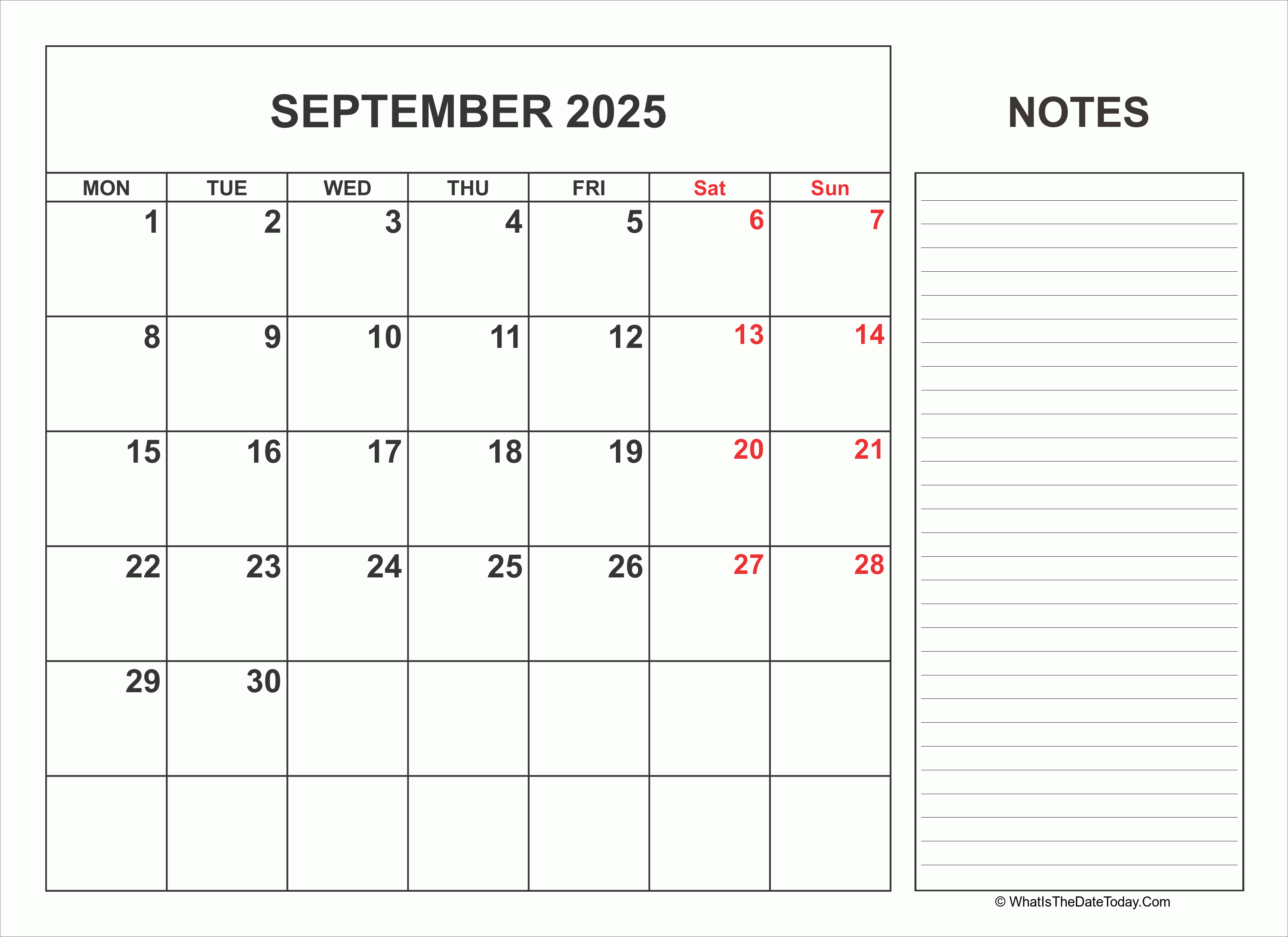 Another 2025 Printable September Calendar with Notes space. This calendar start with monday include weekend highlight and notes space at the right of it.