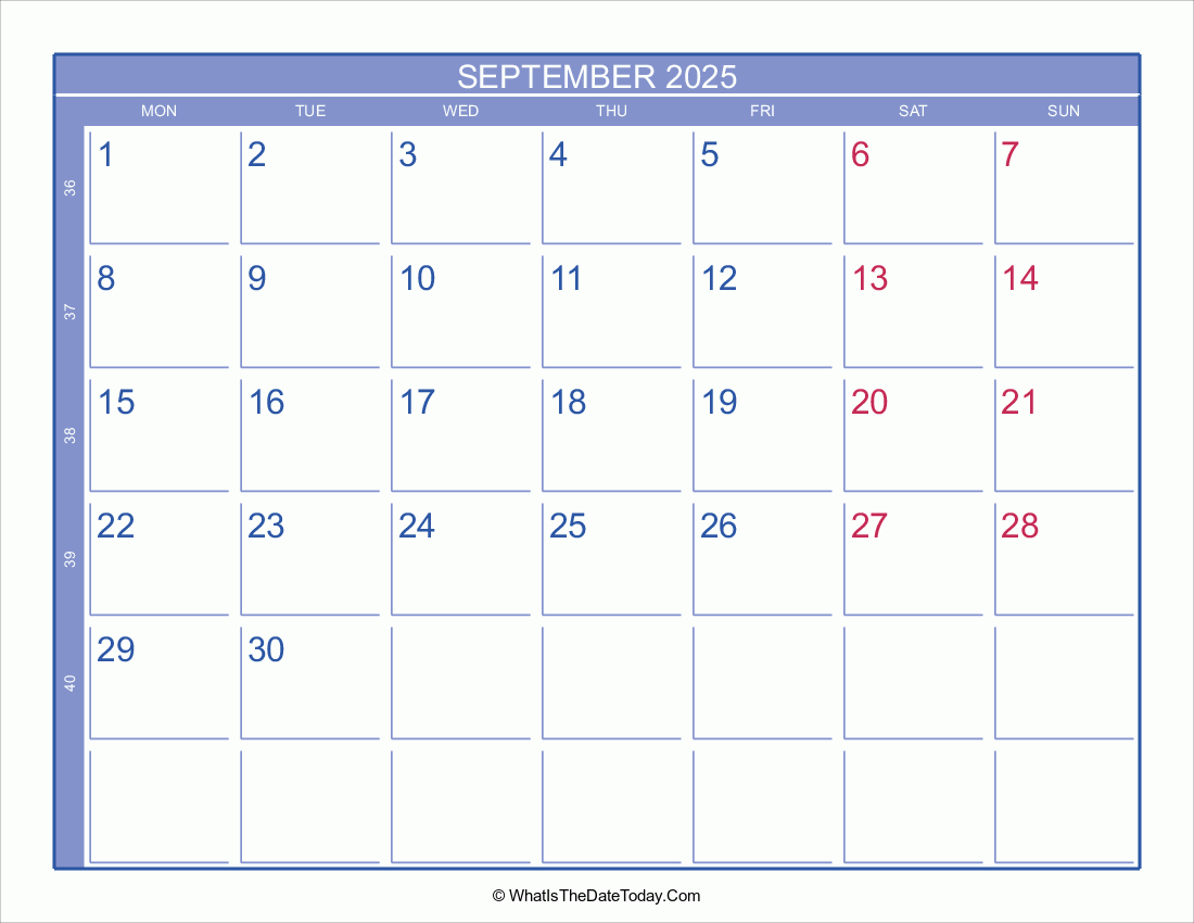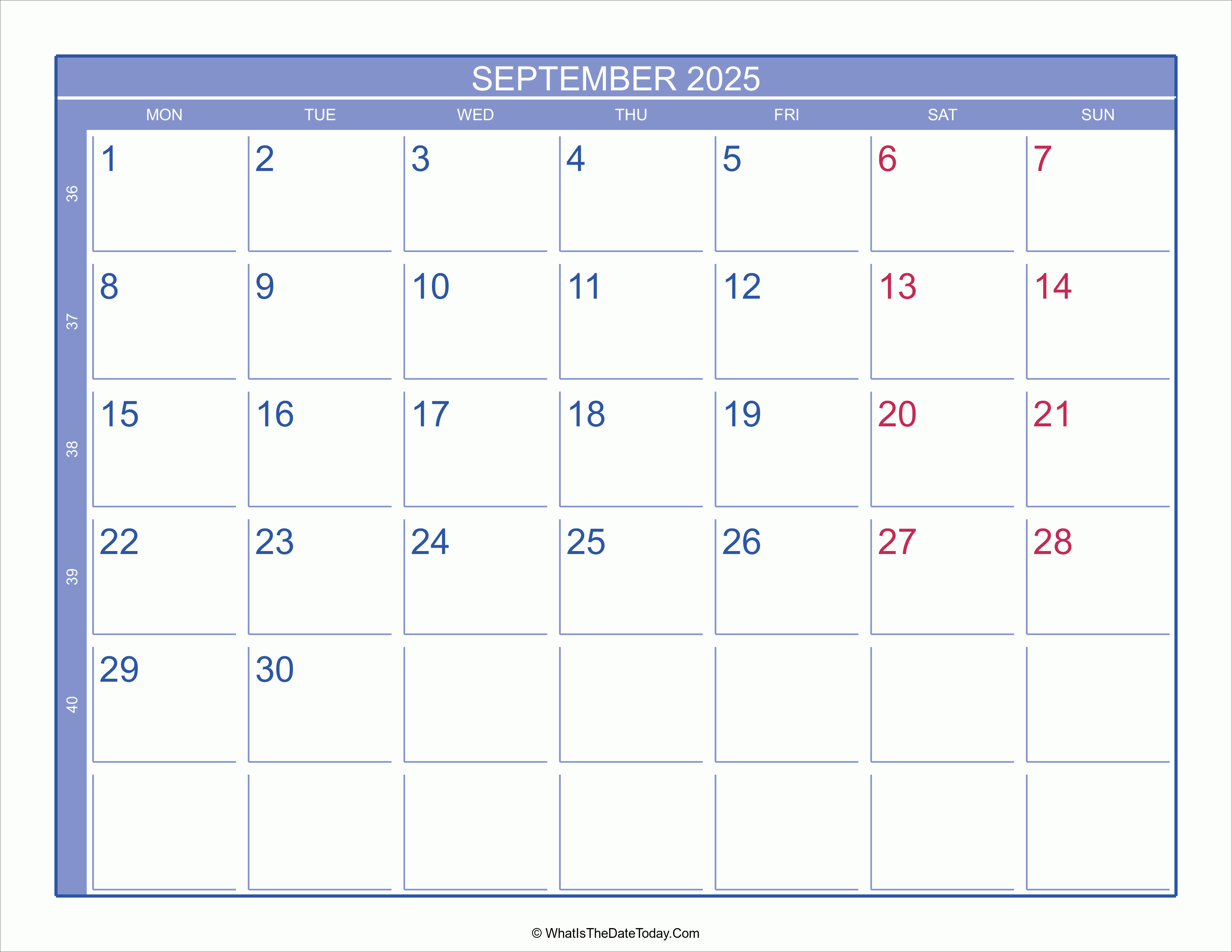This is 2025 September Calendar with Week Numbers in blue color. It also have weekend highlight with red color. Free to download and print!