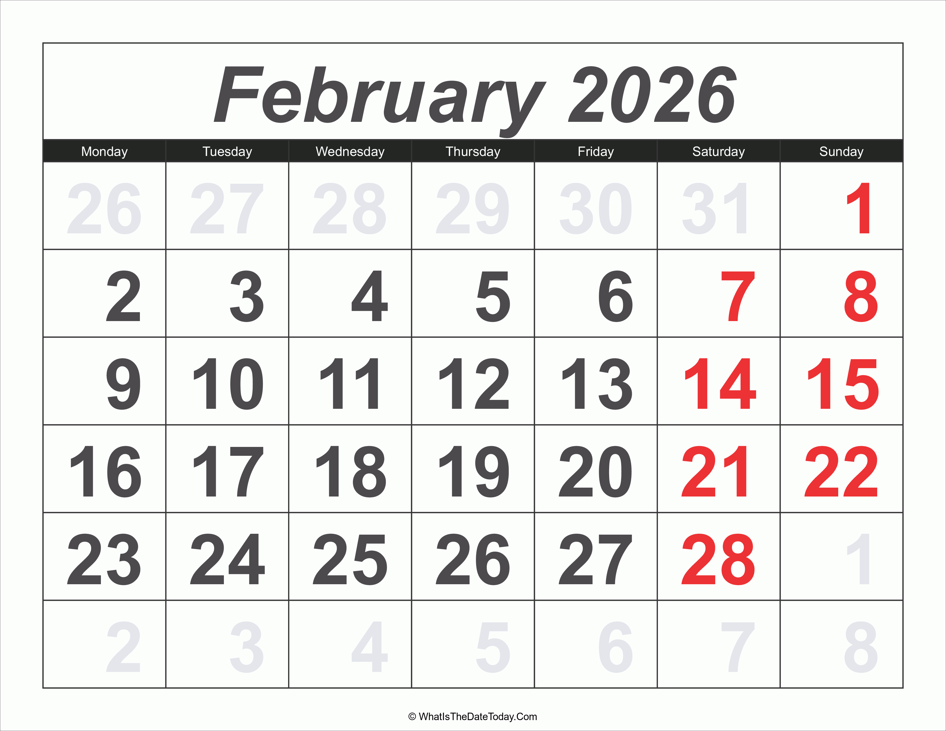 If you are searching for 2026 Calendar February with Large Numbers then this february calendar is for you. It come with all large numbers included weekend highlight in red.