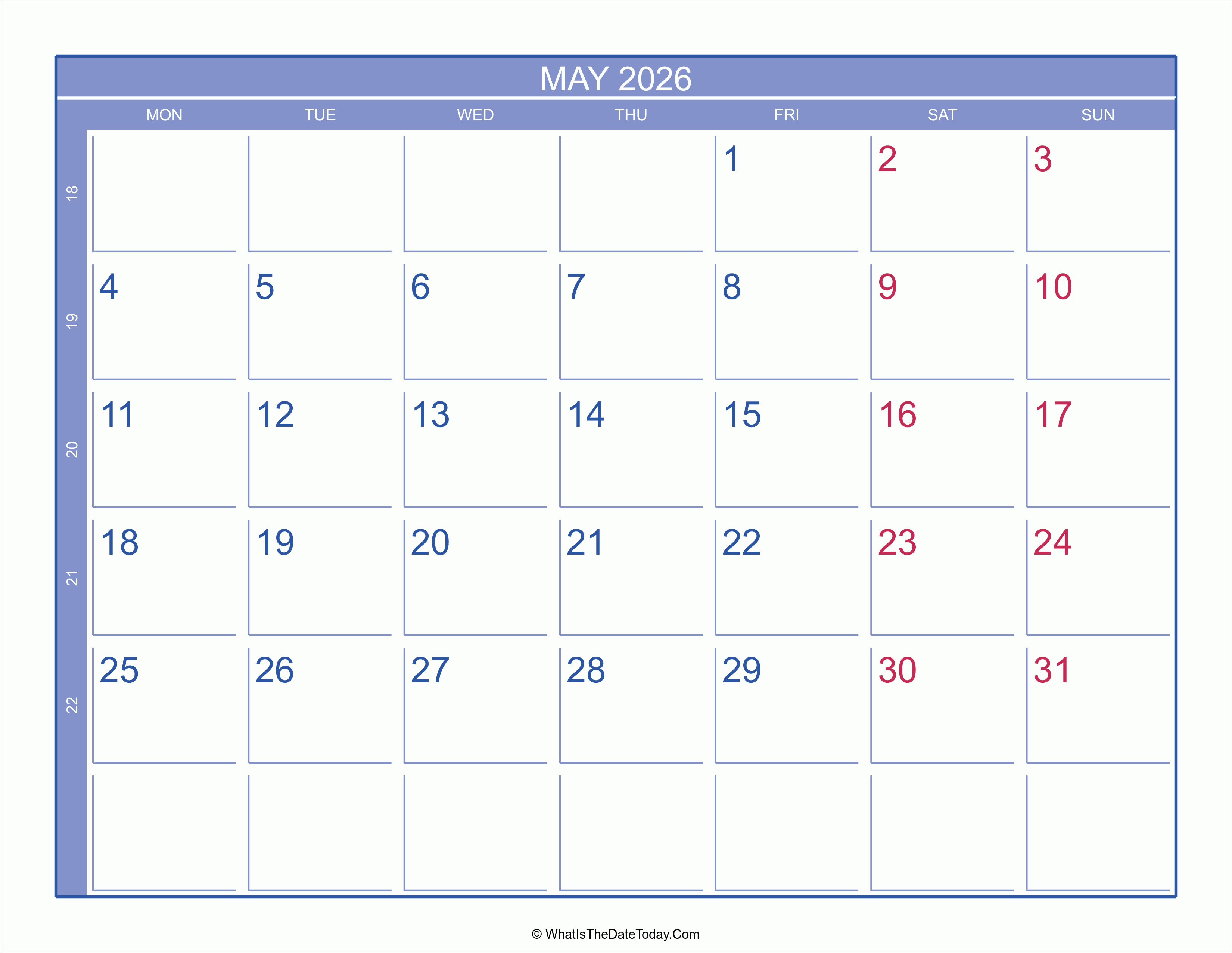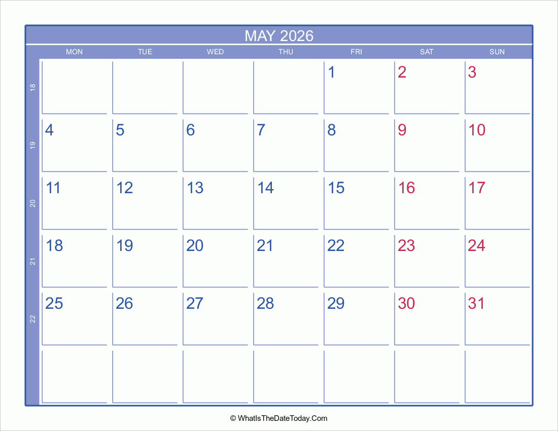 This is 2026 May Calendar with Week Numbers in blue color. It also have weekend highlight with red color. Free to download and print!