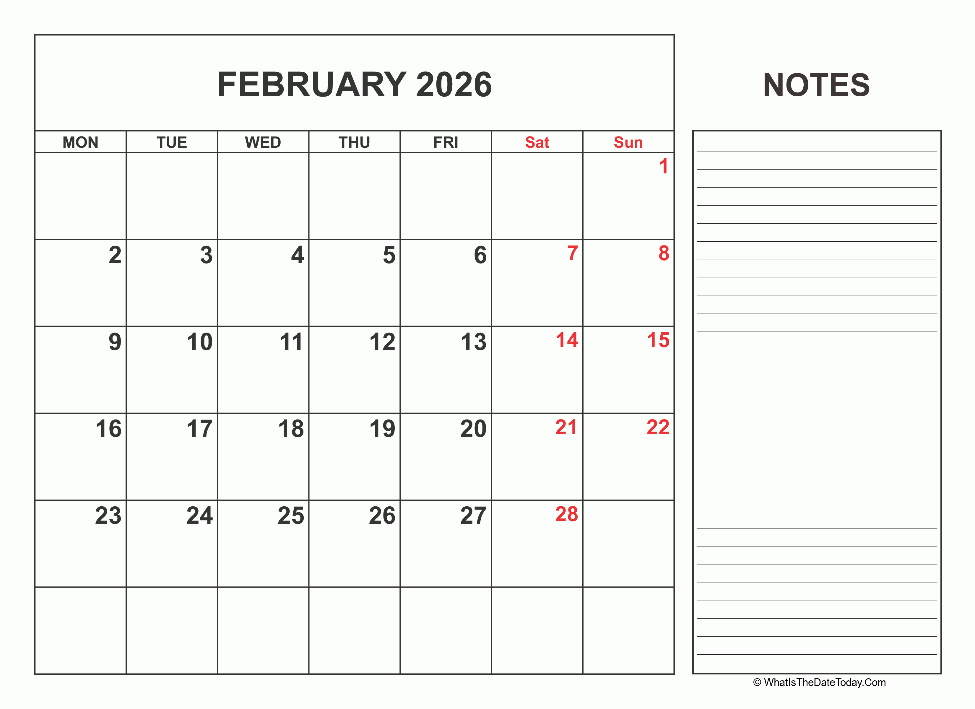 Another 2026 Printable February Calendar with Notes space. This calendar start with monday include weekend highlight and notes space at the right of it.