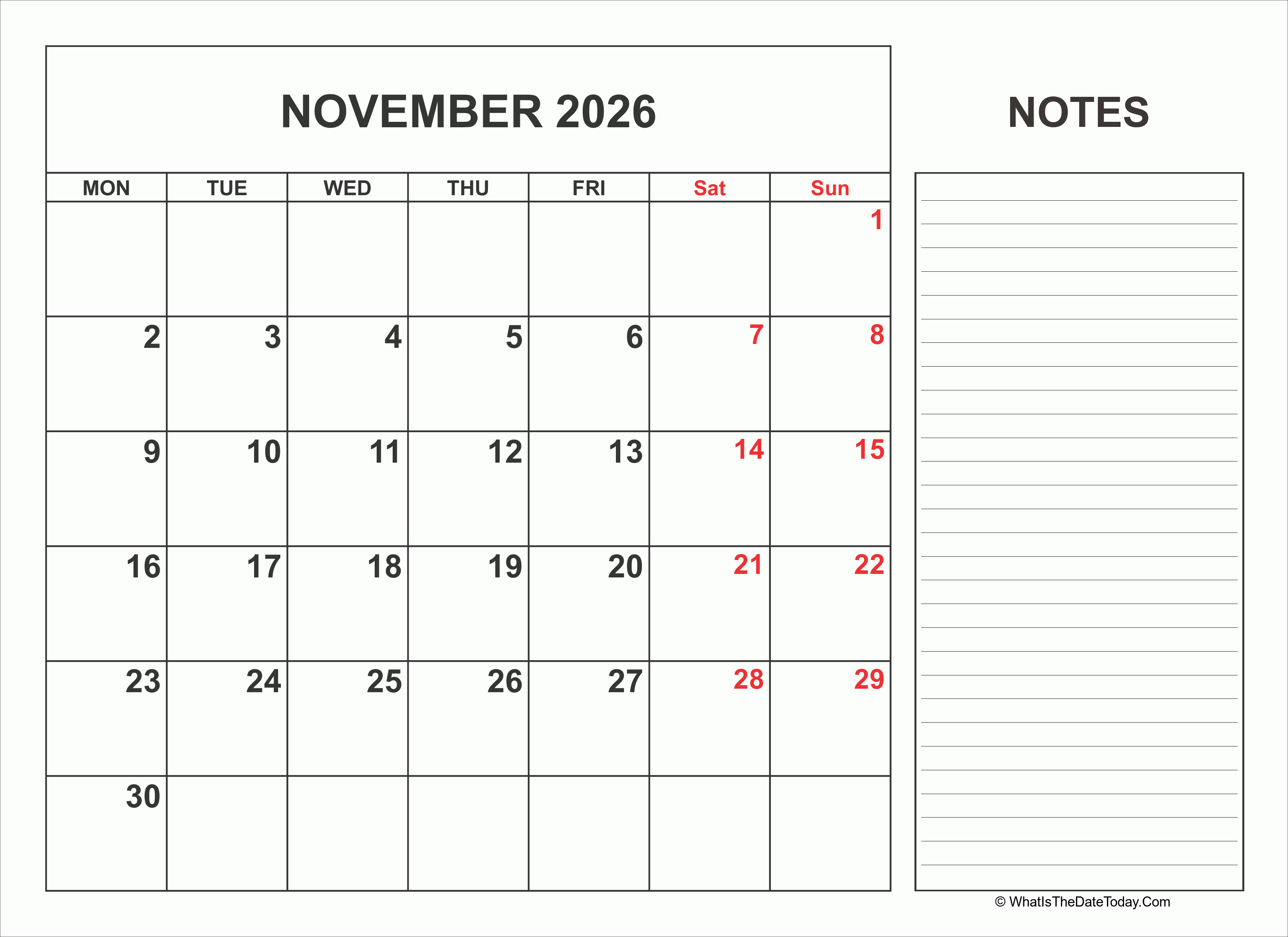 Another 2026 Printable November Calendar with Notes space. This calendar start with monday include weekend highlight and notes space at the right of it.