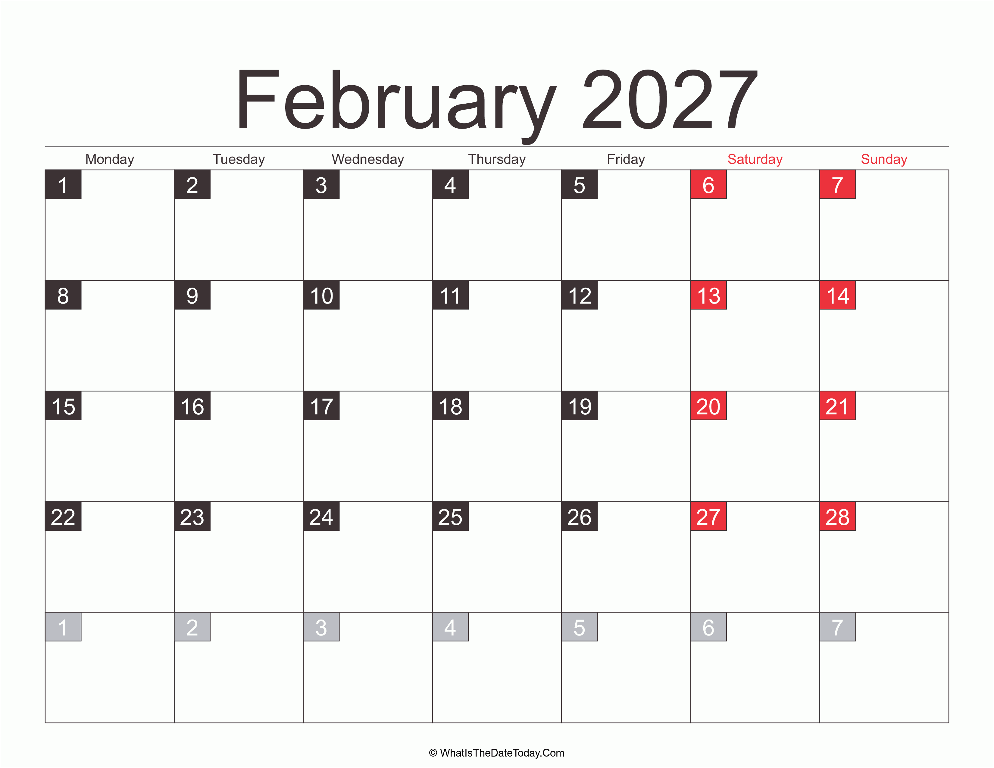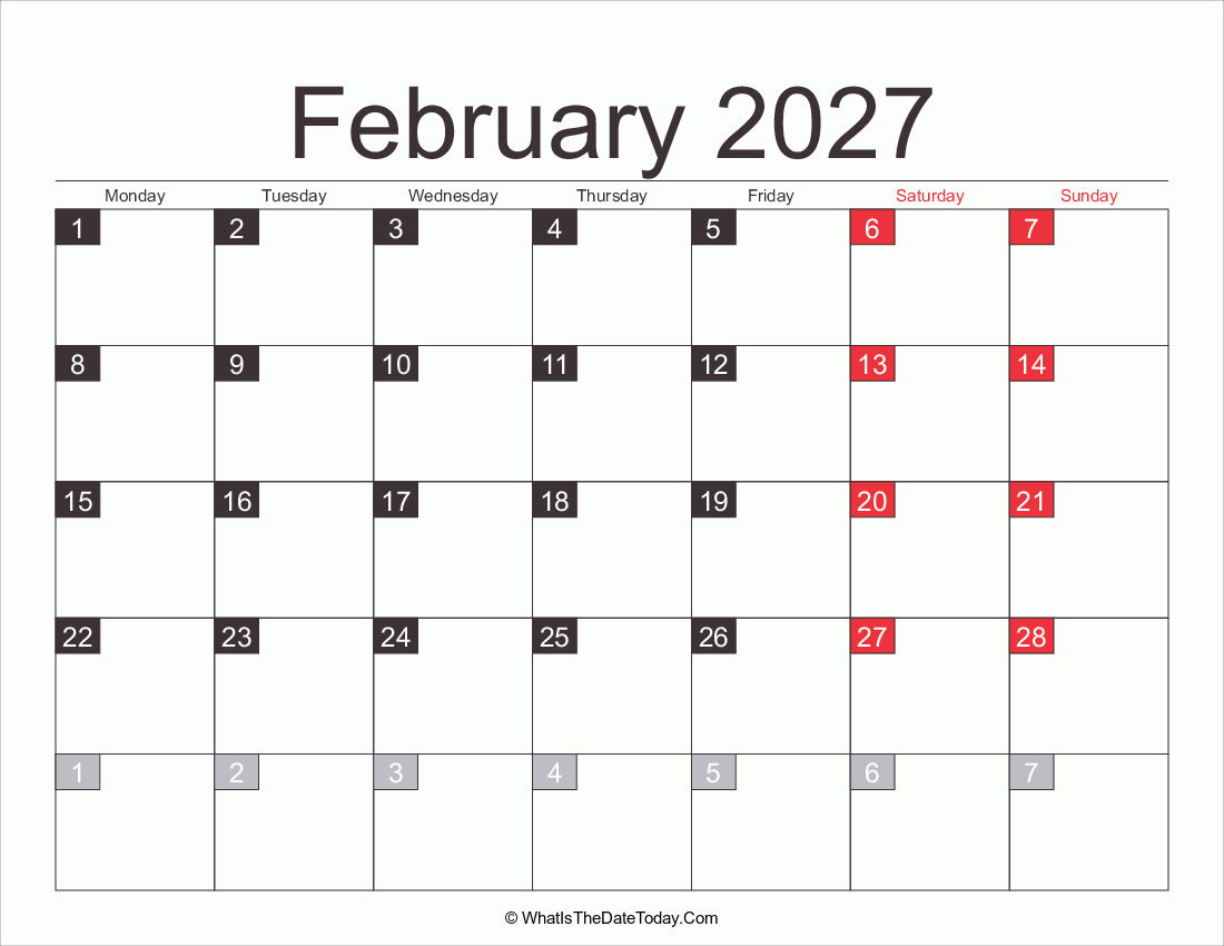 2027 February Calendar Printable is free monthly calendar 2027 which can easy to download and print. This calendar available in PNG or PDF format with landscape layout.