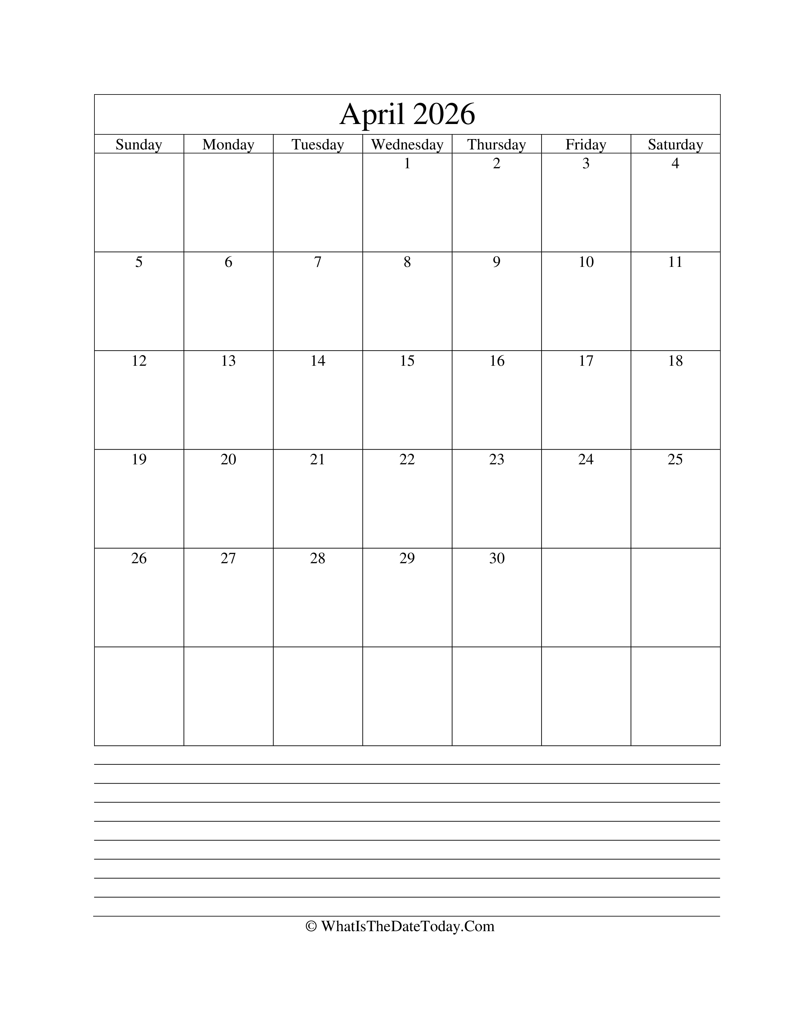 FREE download April 2026 Calendar Editable (vertical layout) with Notes Space at footer - A free printable monthly calendar 2026 for april. The calendar available in three formats: Word (.docx), PDF and PNG.