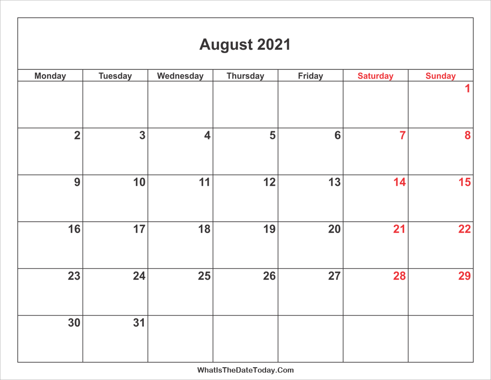 August 2021 Calendar with Weekend Highlight is a simple calendar with saturday and sunday columns highlight in red color. Free to download and print your monthly calendar 2021 now.