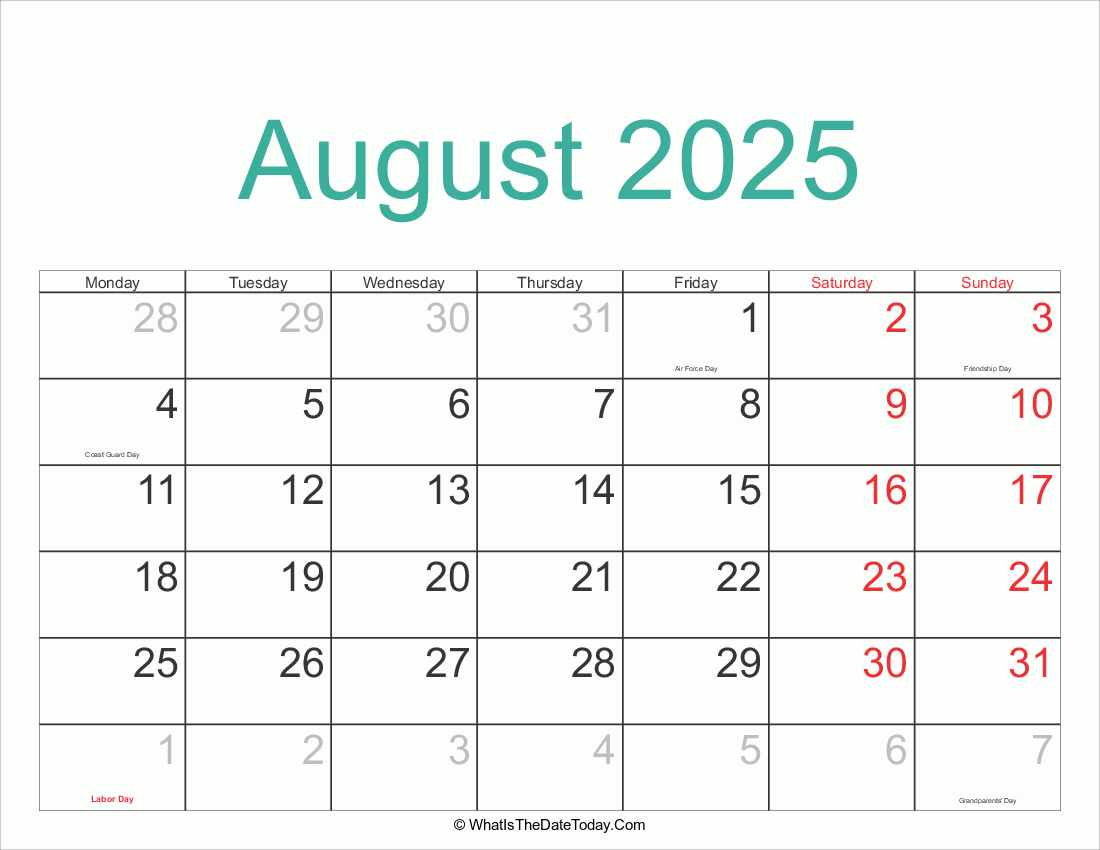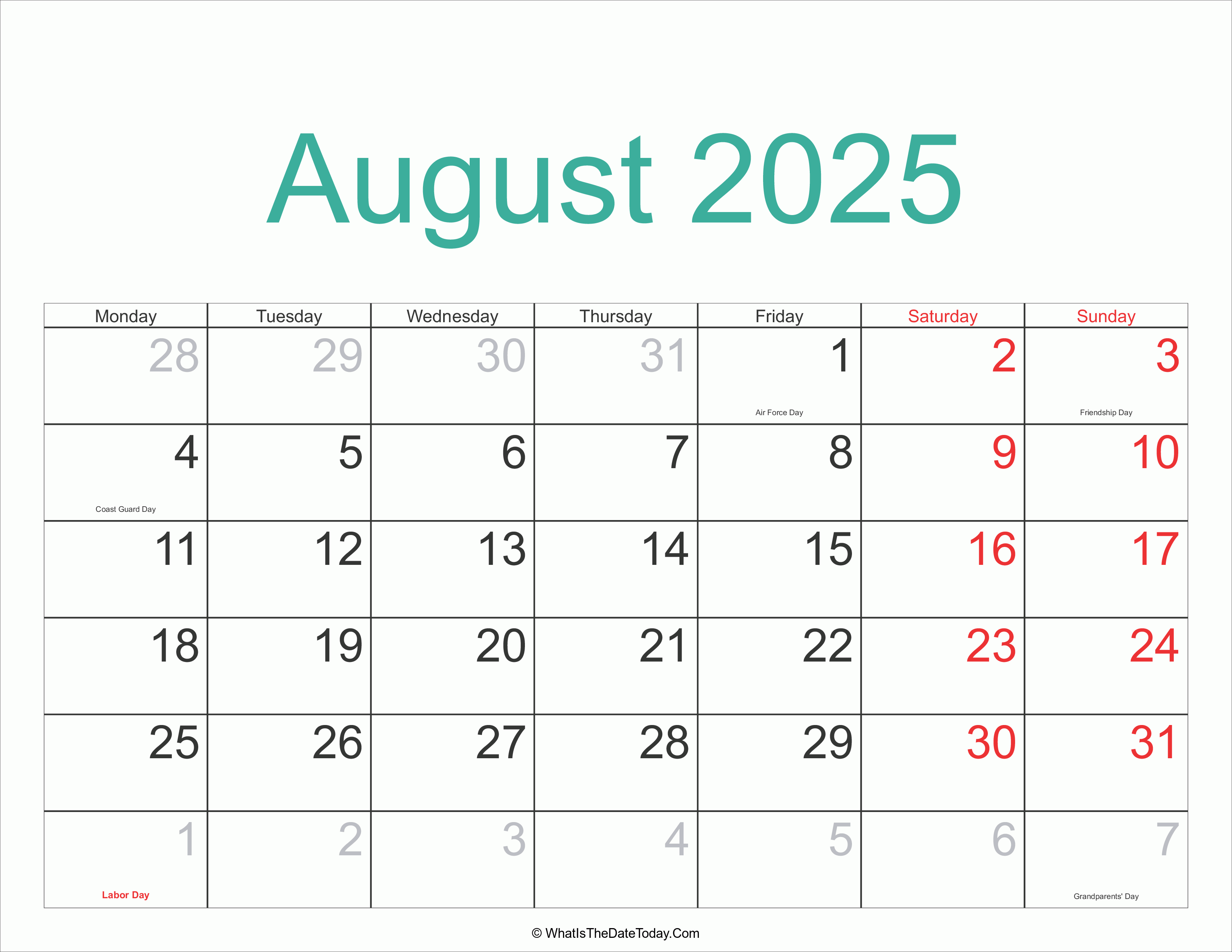 August 2025 Calendar Printable with Holidays is an other monthly calendar for 2025. This calendar include US Federal Holidays and national holidays 2025.