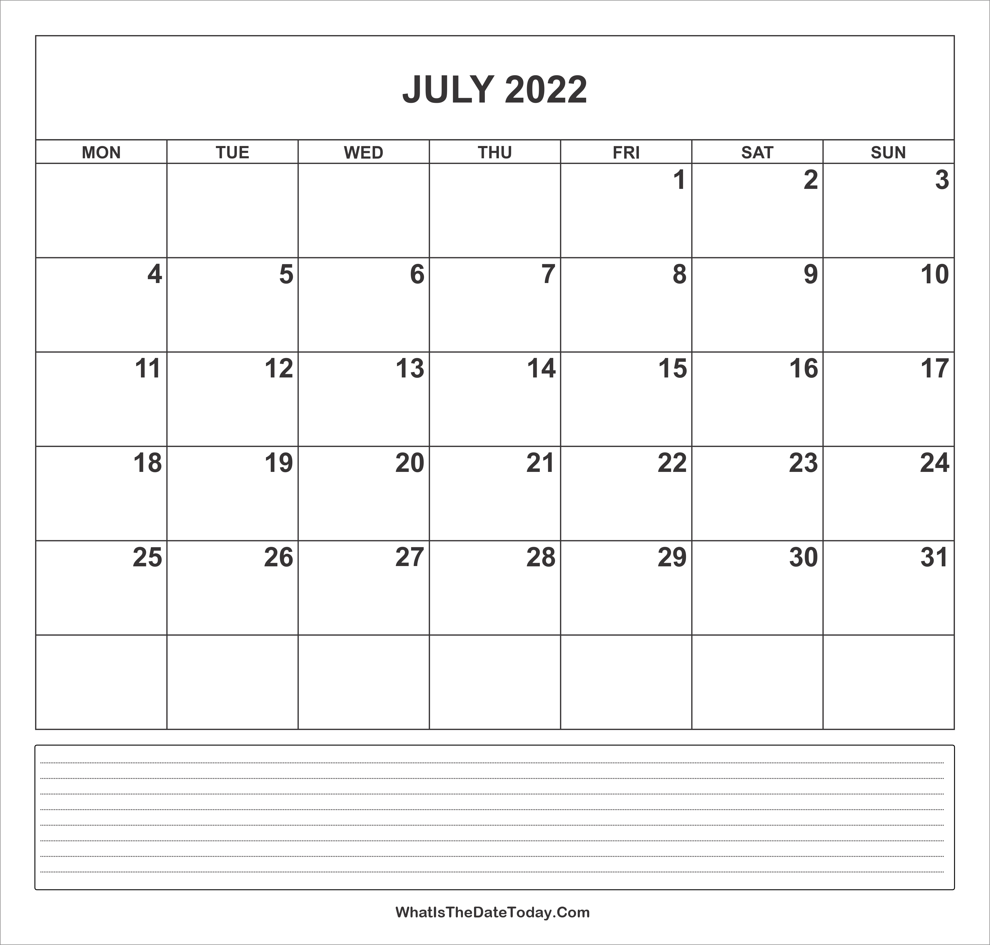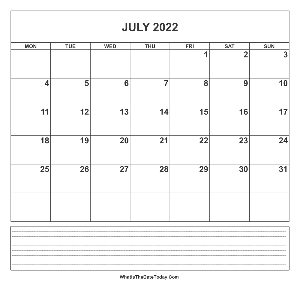 Want to write inportant notes to your calendar? This Calendar July 2022 with Notes space is for you. It is suitable for a monthly planner and use at school, home or offices.