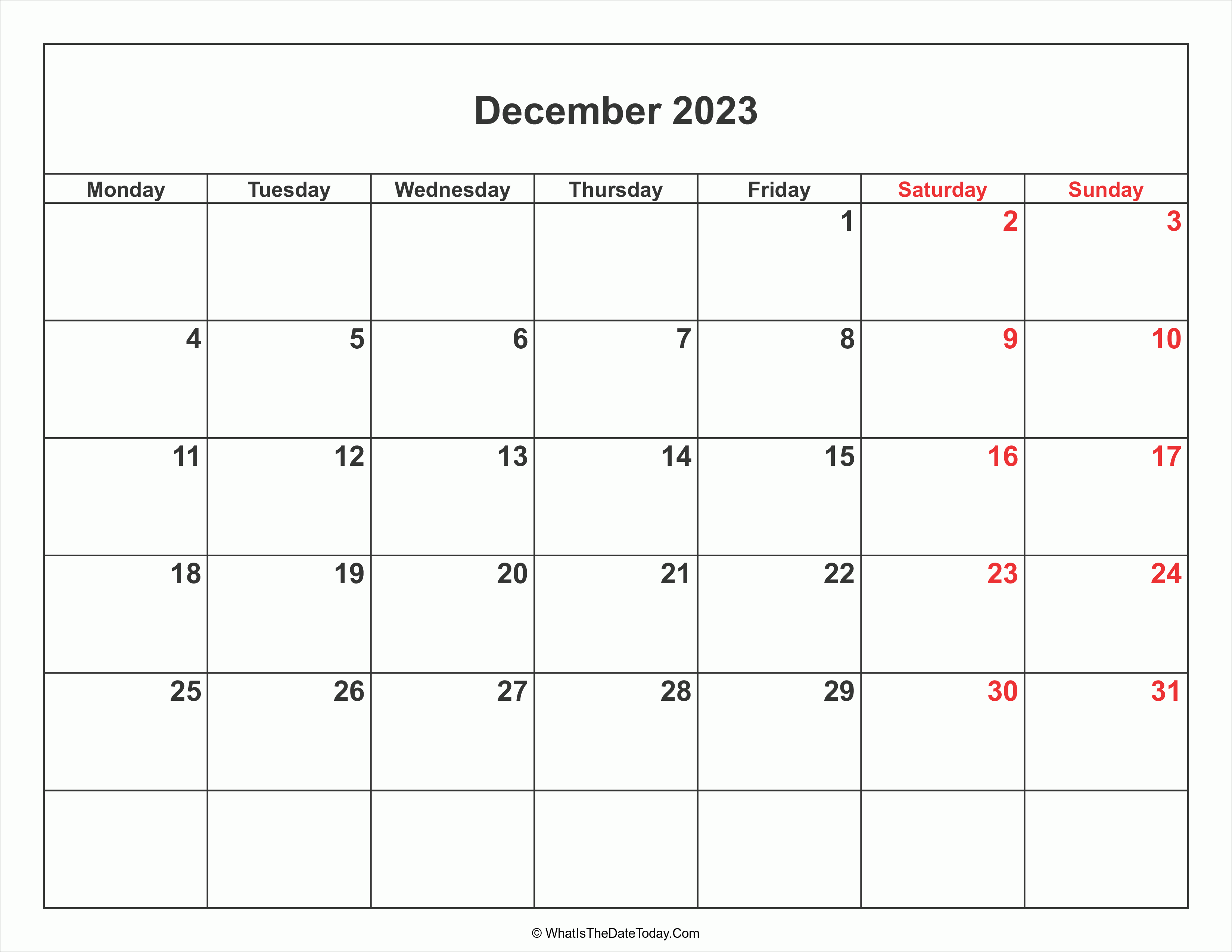 December 2023 Calendar with Weekend Highlight is a simple calendar with saturday and sunday columns highlight in red color. Free to download and print your monthly calendar 2023 now.