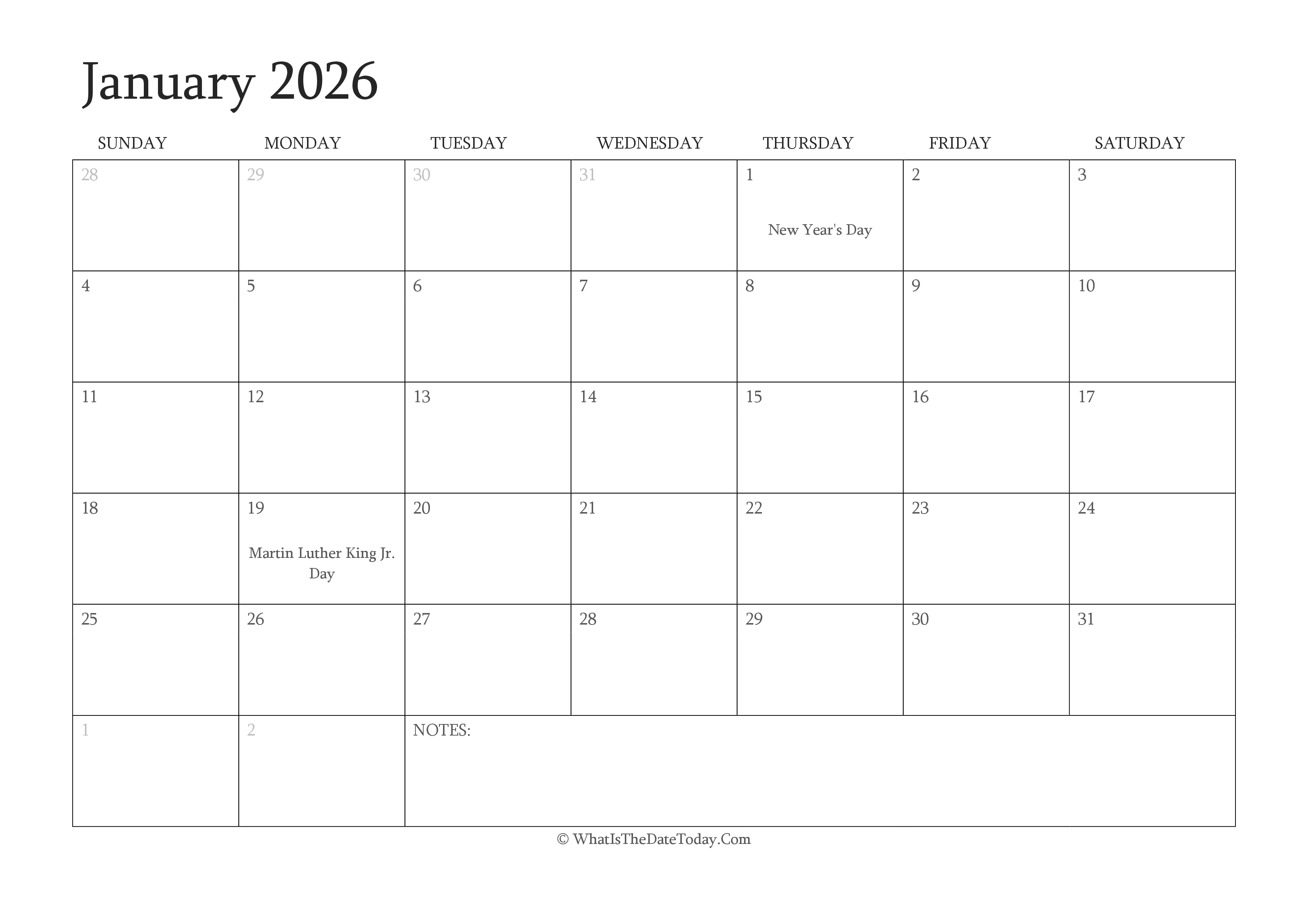 Download and print Editable Calendar January 2026 with Holidays for FREE. Monthly printable calendar for all Months of 2026 calendar, 2027 calendar and 2028 calendar are already available.