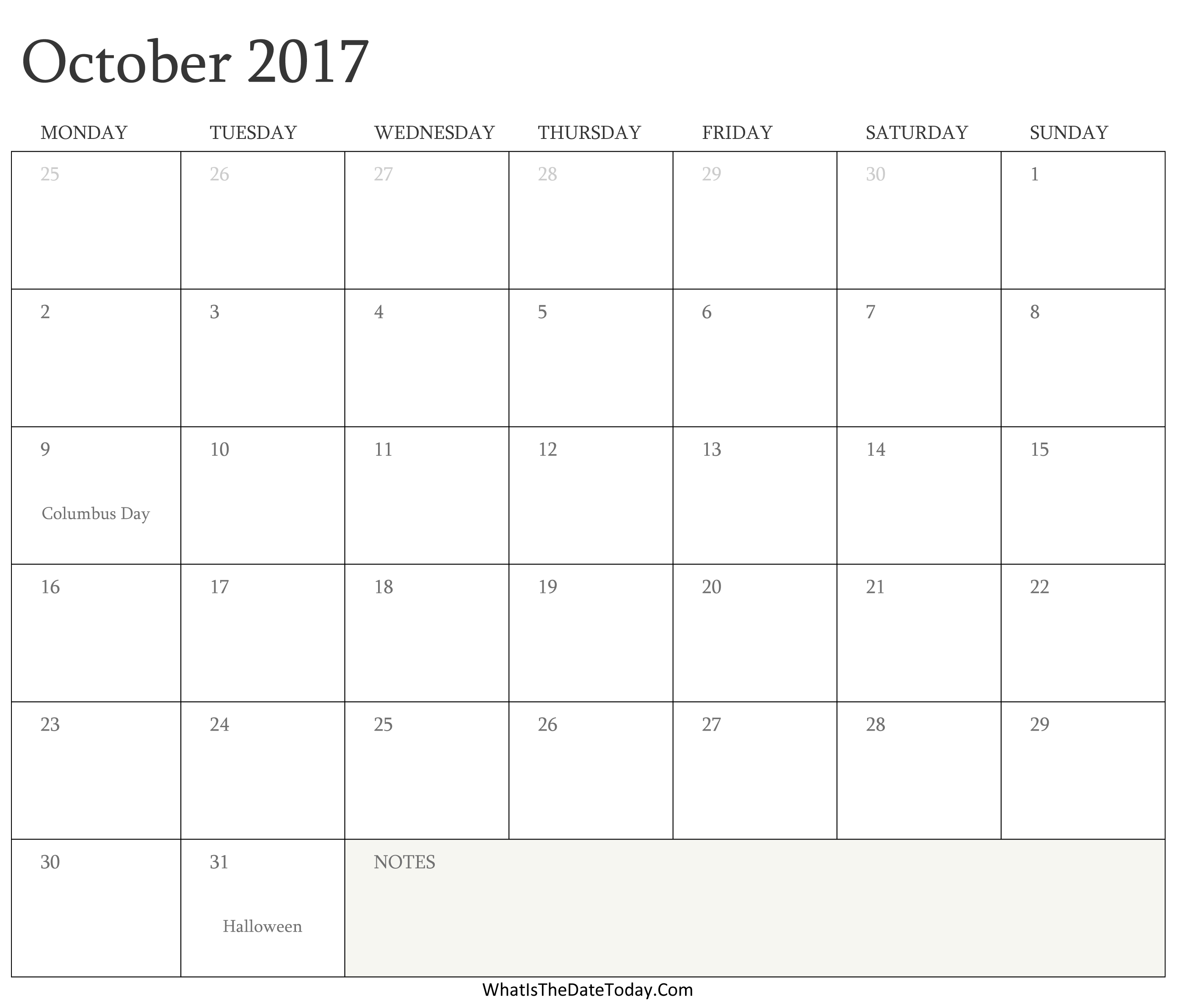 Editable Calendar October 2017 with Holidays