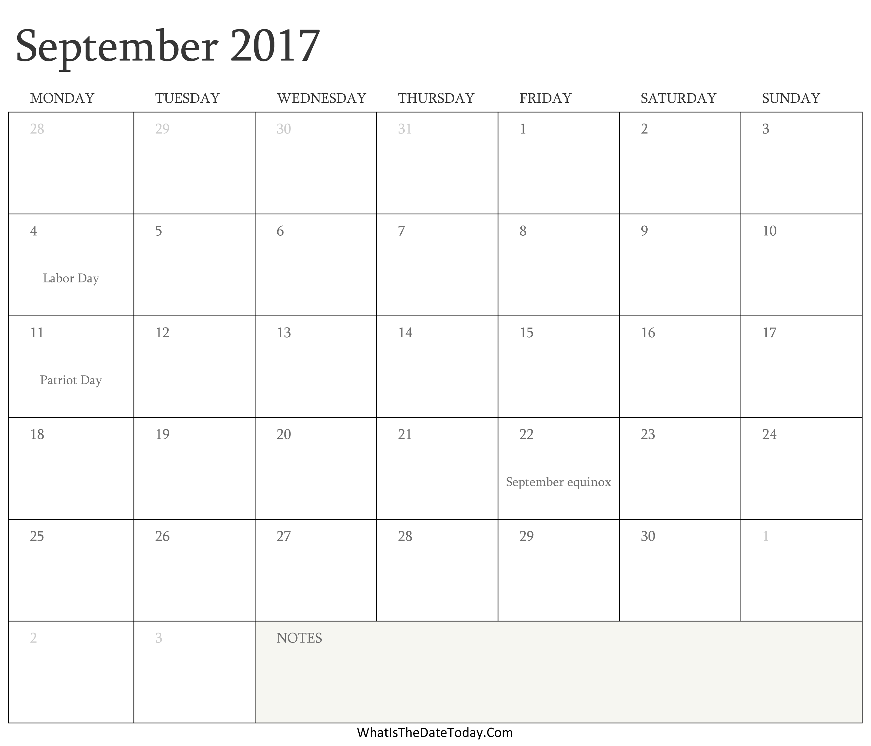Download and print Editable Calendar September 2017 with Holidays for FREE. Monthly printable calendar for all Months of 2017 calendar, 2018 calendar and 2019 calendar are already available.