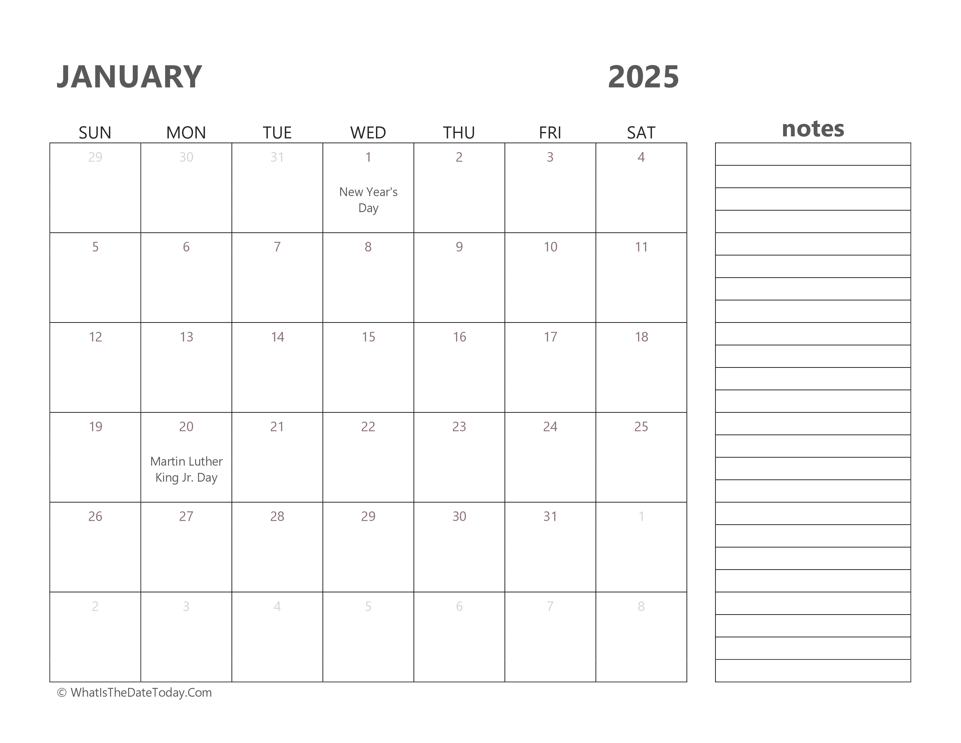 Editable January 2025 Calendar with Holidays and Notes