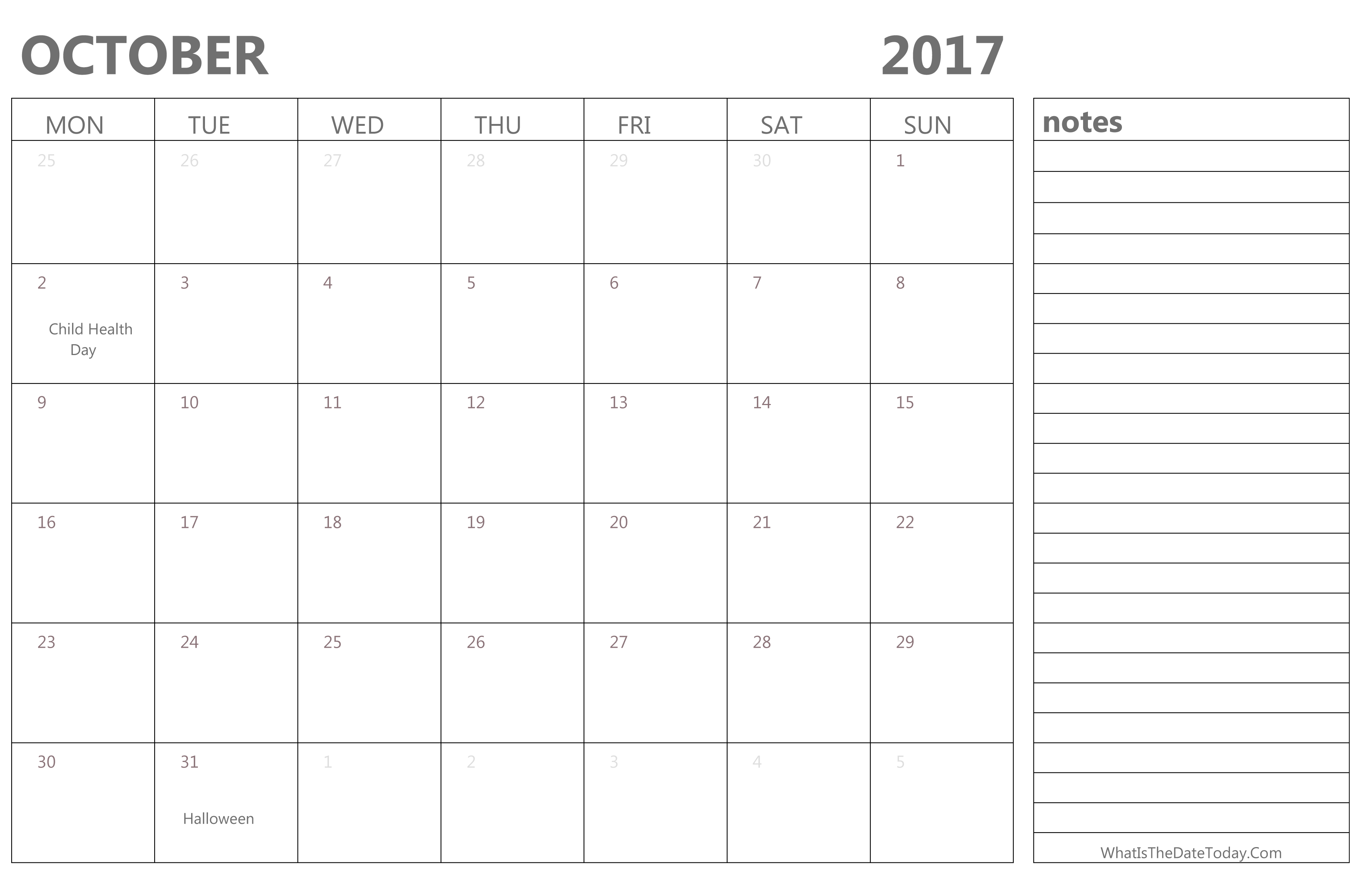 Editable October 2017 Calendar with Holidays and Notes