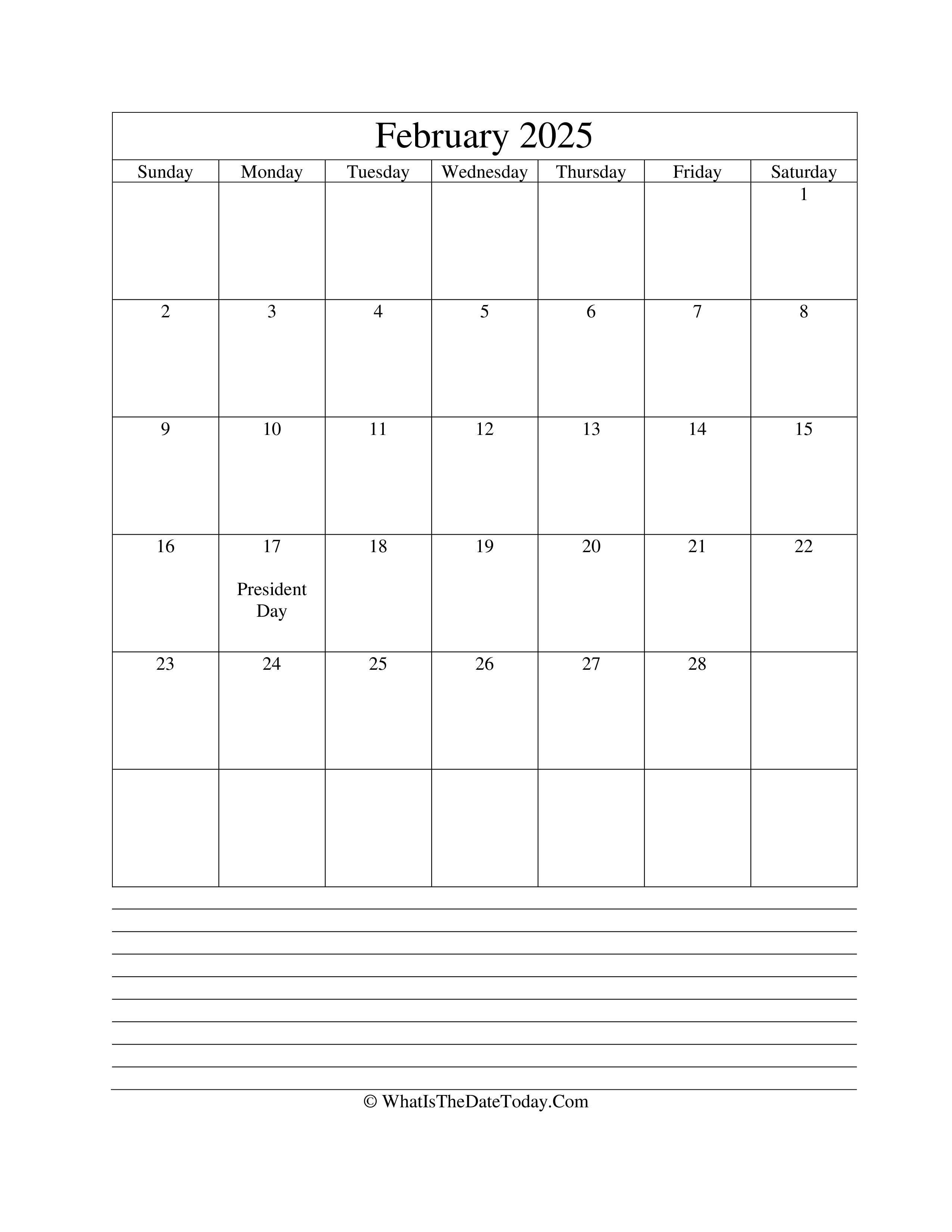 FREE download February 2025 Calendar Editable (vertical layout) with Notes Space at footer - A free printable monthly calendar 2025 for february. The calendar available in three formats: Word (.docx), PDF and PNG.