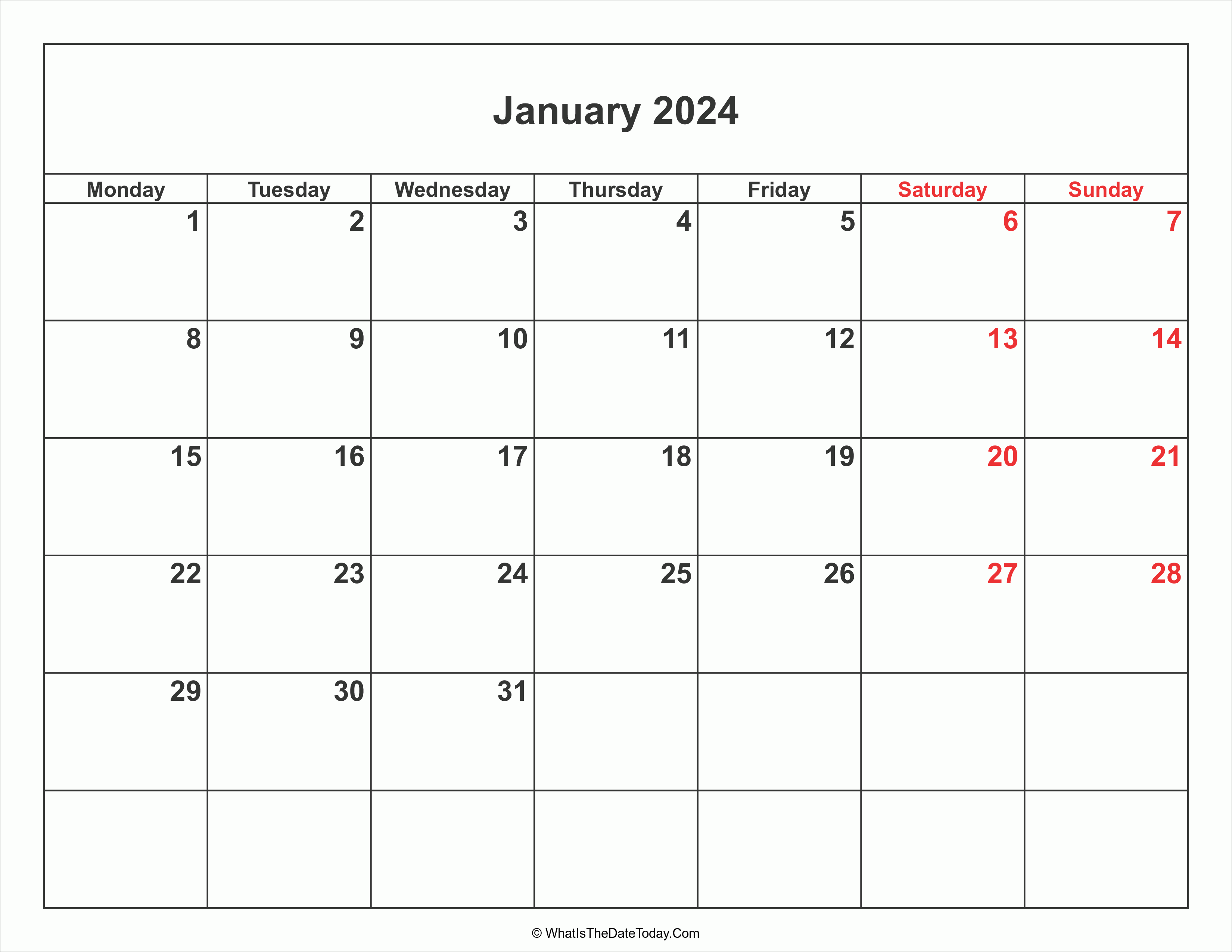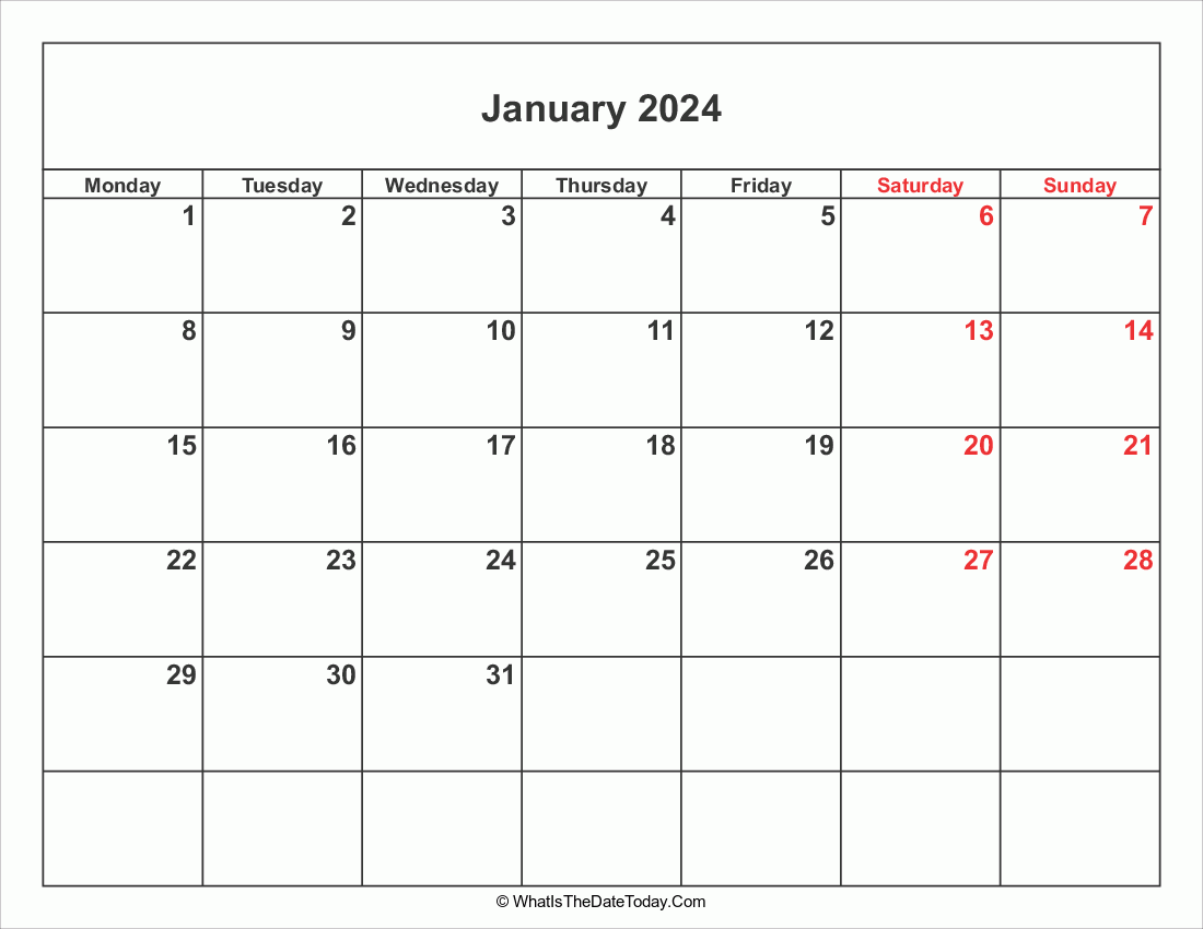 January 2024 Calendar with Weekend Highlight is a simple calendar with saturday and sunday columns highlight in red color. Free to download and print your monthly calendar 2024 now.