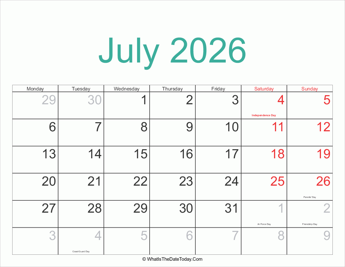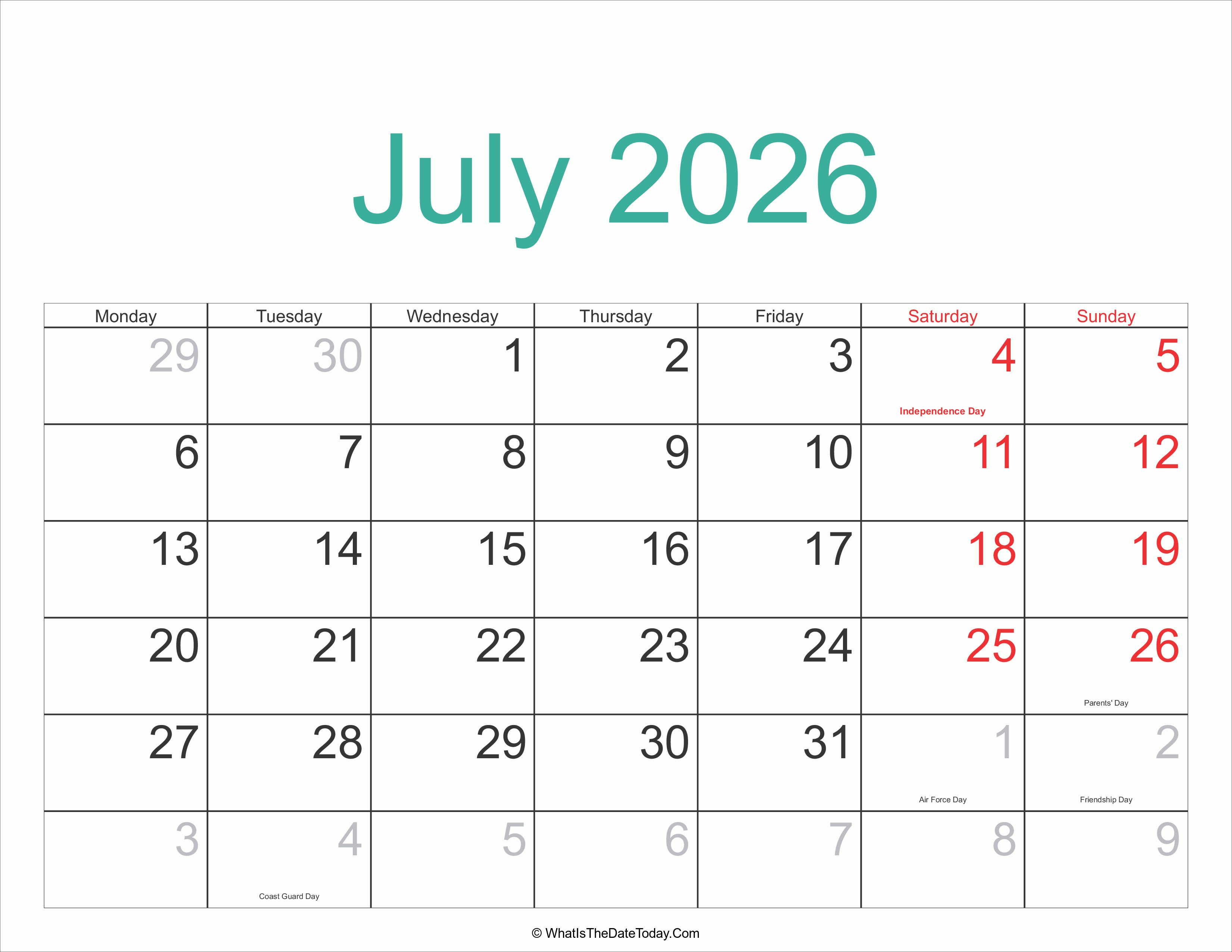 July 2026 Calendar Printable with Holidays is an other monthly calendar for 2026. This calendar include US Federal Holidays and national holidays 2026.