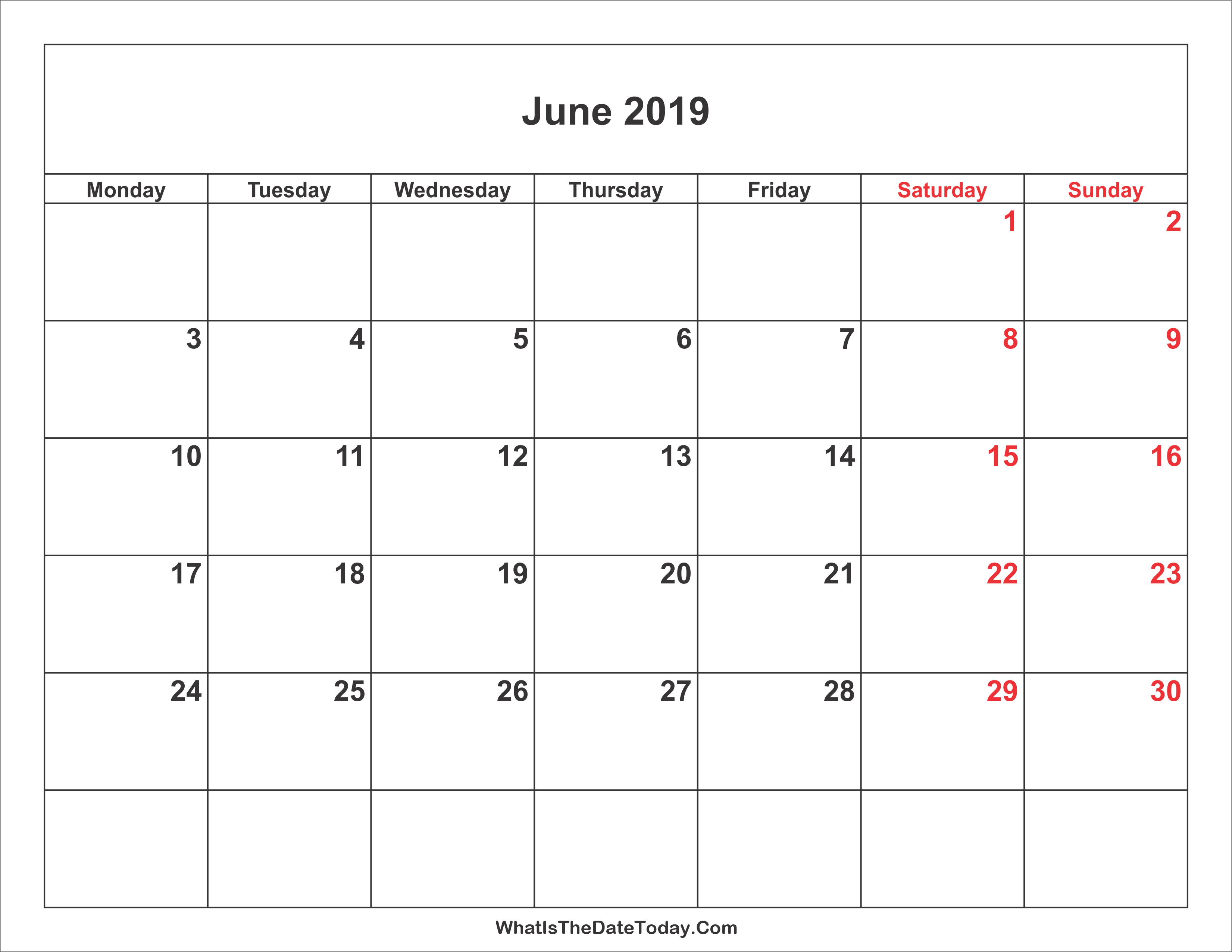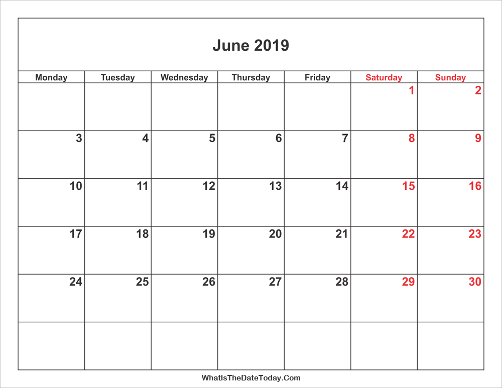 June 2019 Calendar with Weekend Highlight is a simple calendar with saturday and sunday columns highlight in red color. Free to download and print your monthly calendar 2019 now.