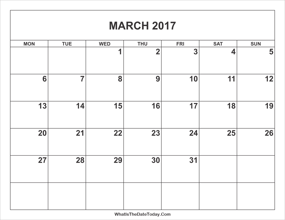 This is a simple and blank March 2017 Calendar designed in black and white color. Easy to download, add holidays or events then print.
