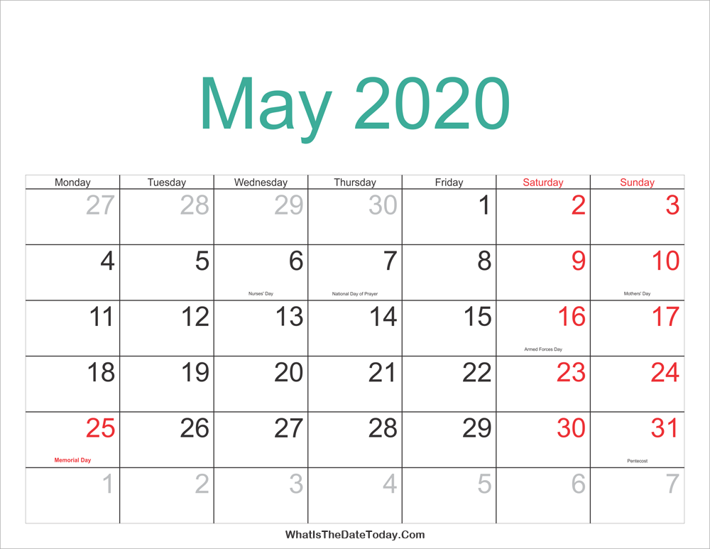 May 2020 Calendar Printable with Holidays is an other monthly calendar for 2020. This calendar include US Federal Holidays and national holidays 2020.