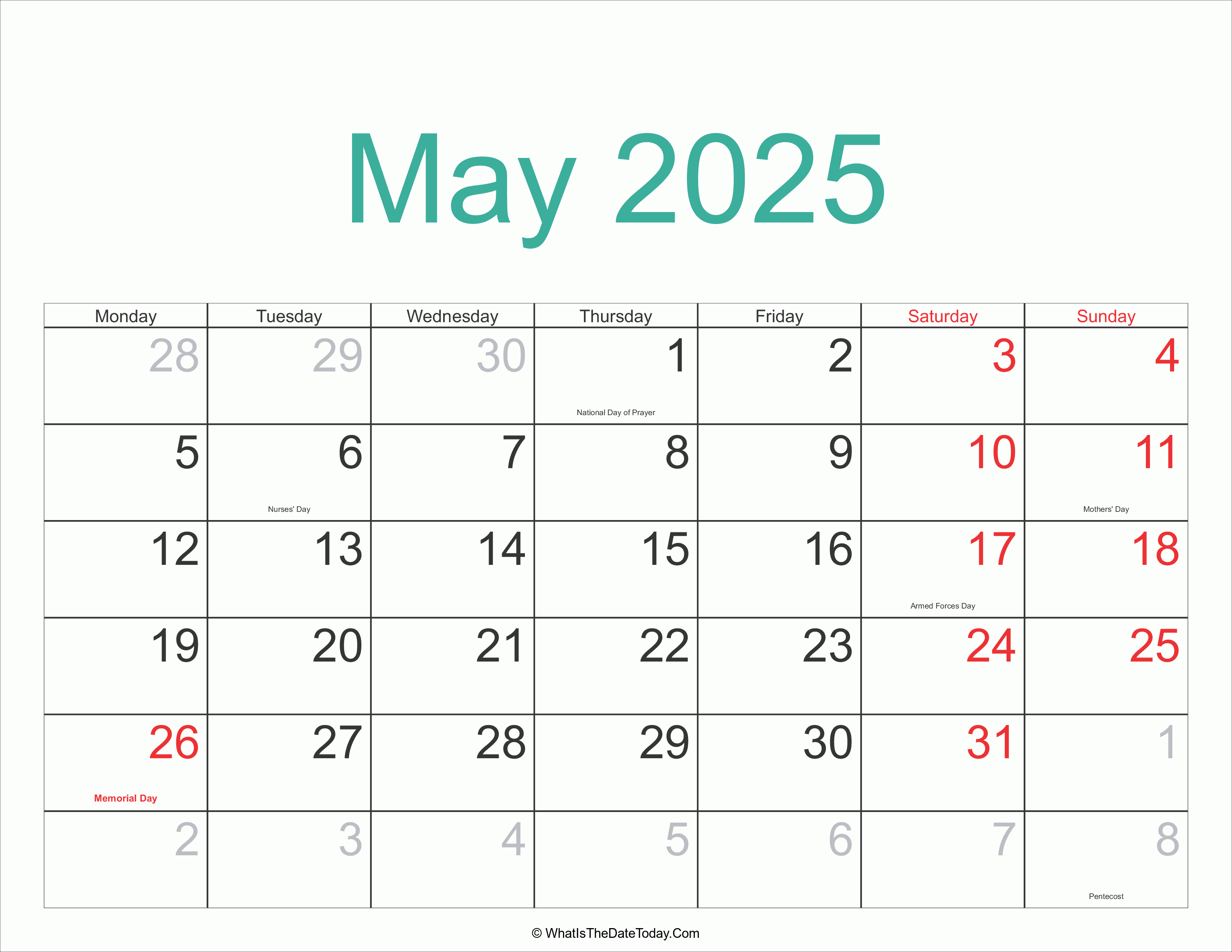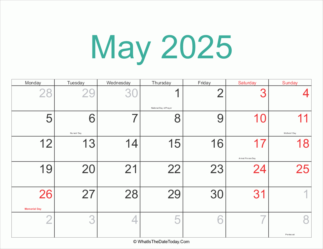 May 2025 Calendar Printable with Holidays is an other monthly calendar for 2025. This calendar include US Federal Holidays and national holidays 2025.