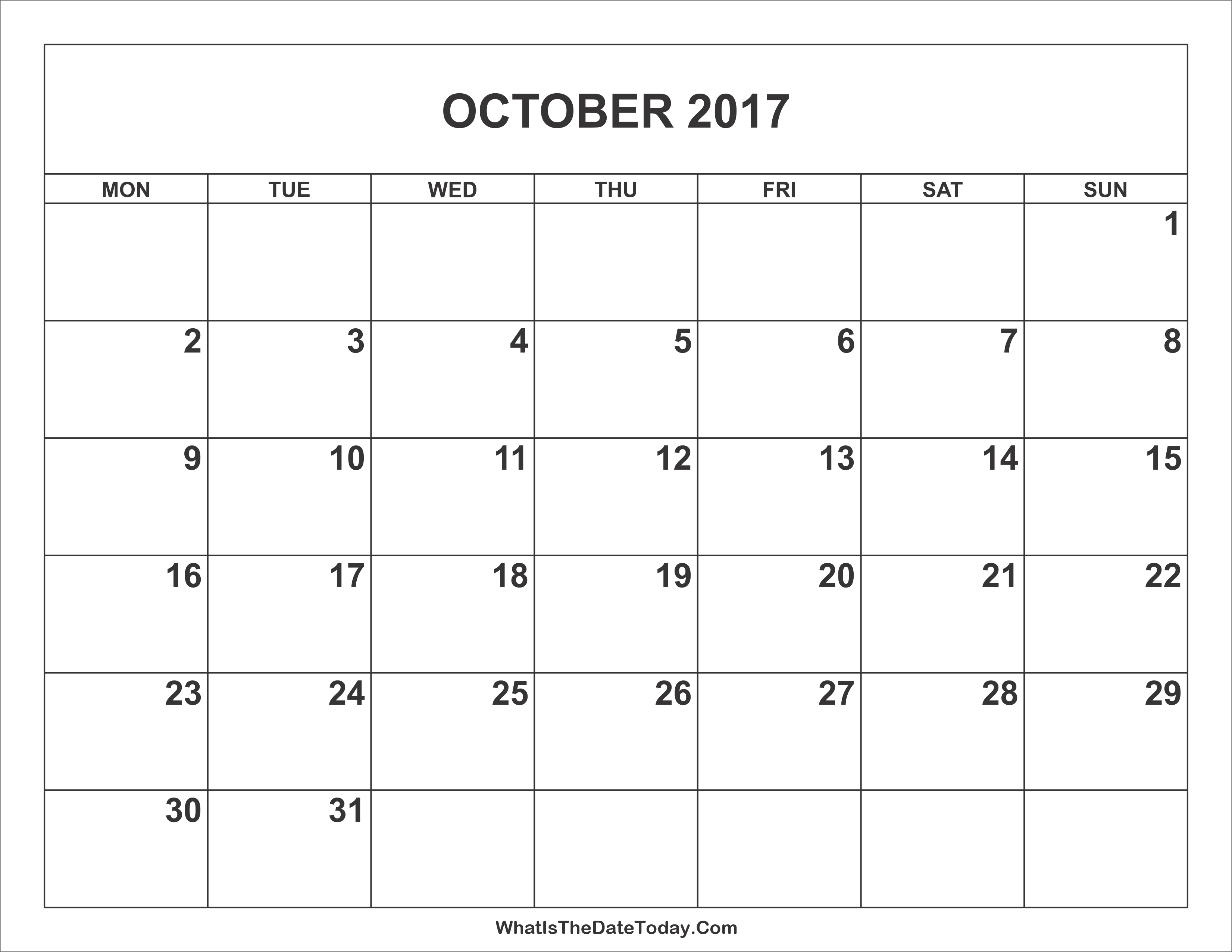This is a simple and blank October 2017 Calendar designed in black and white color. Easy to download, add holidays or events then print.
