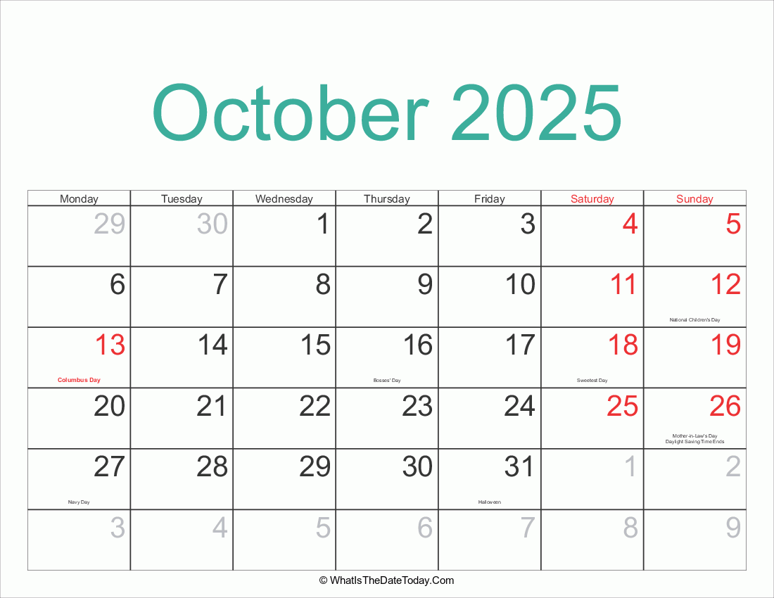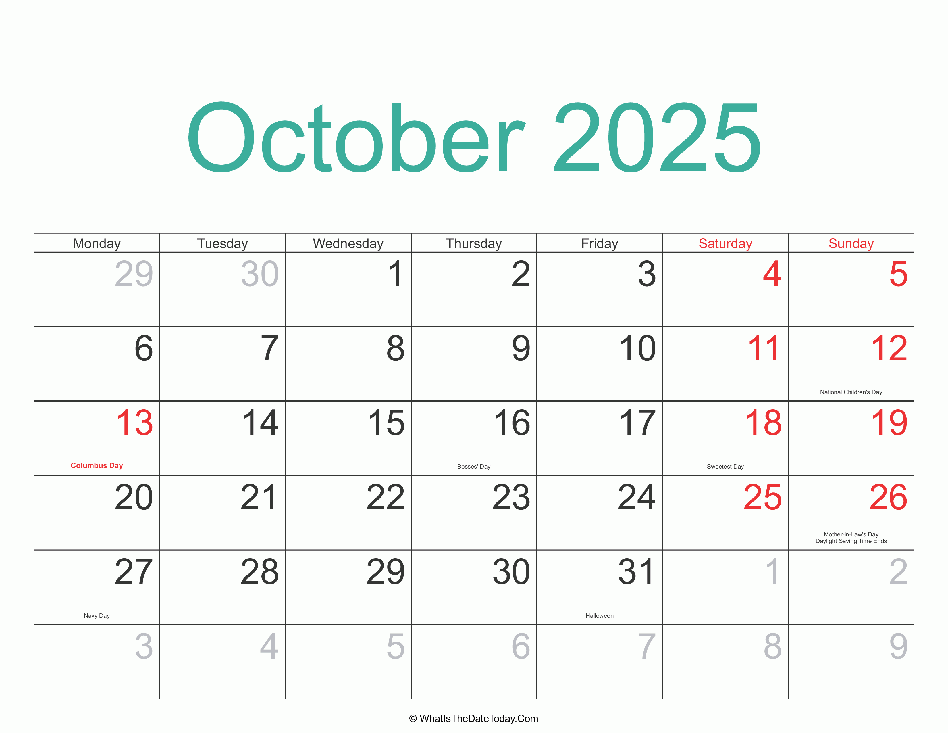 October 2025 Calendar Printable with Holidays is an other monthly calendar for 2025. This calendar include US Federal Holidays and national holidays 2025.
