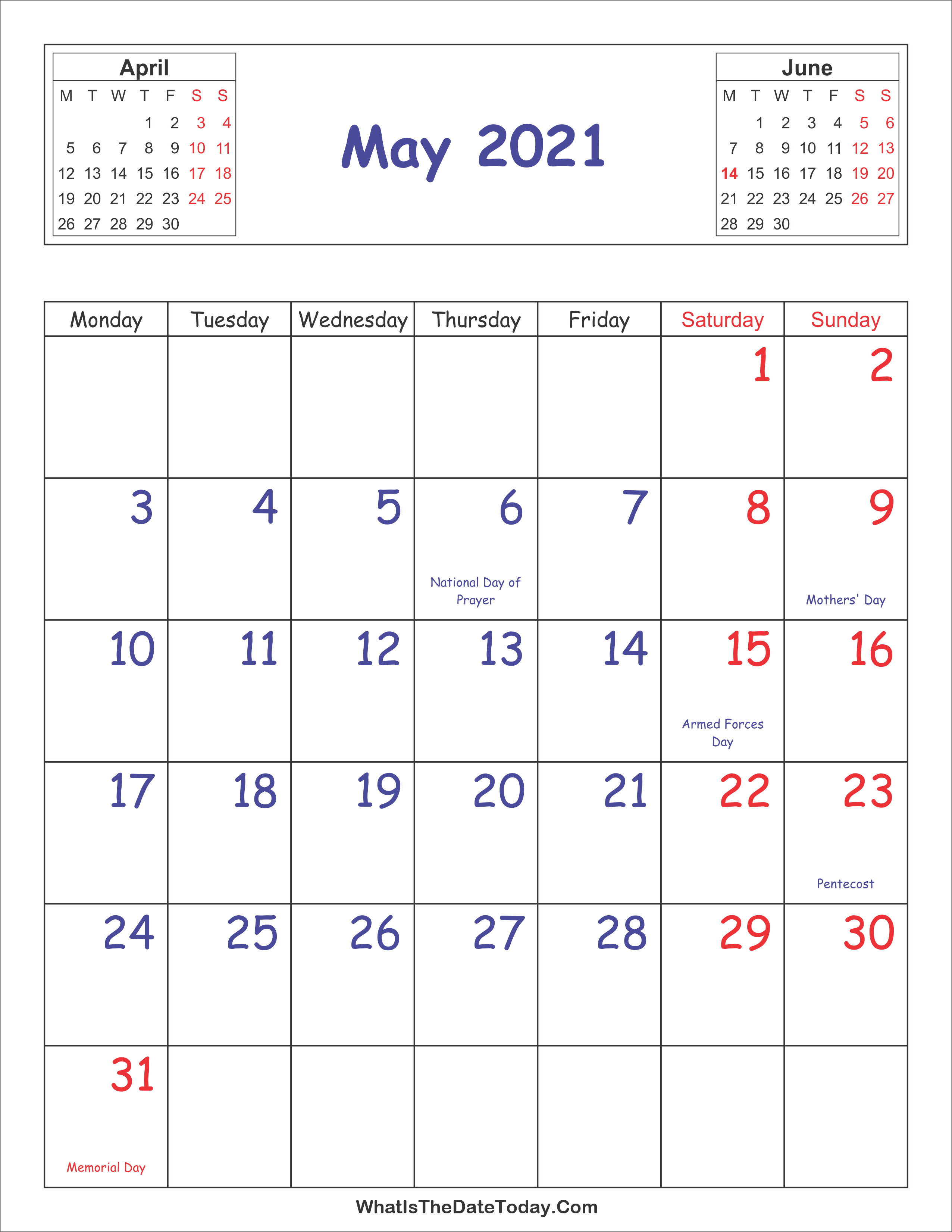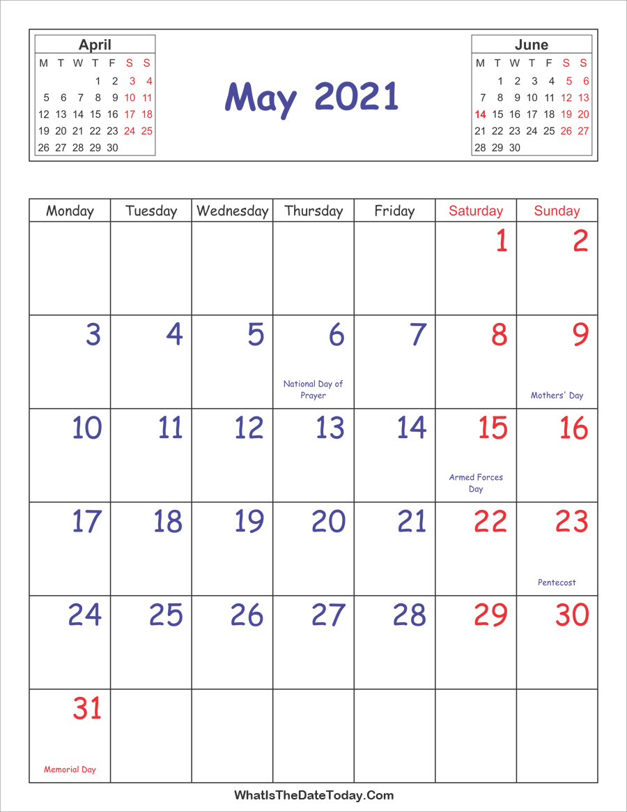 This Printable 2021 Calendar May (Vertical Layout) is a available for download in PNG format. The calendar come with colorful font in black, blue and red.