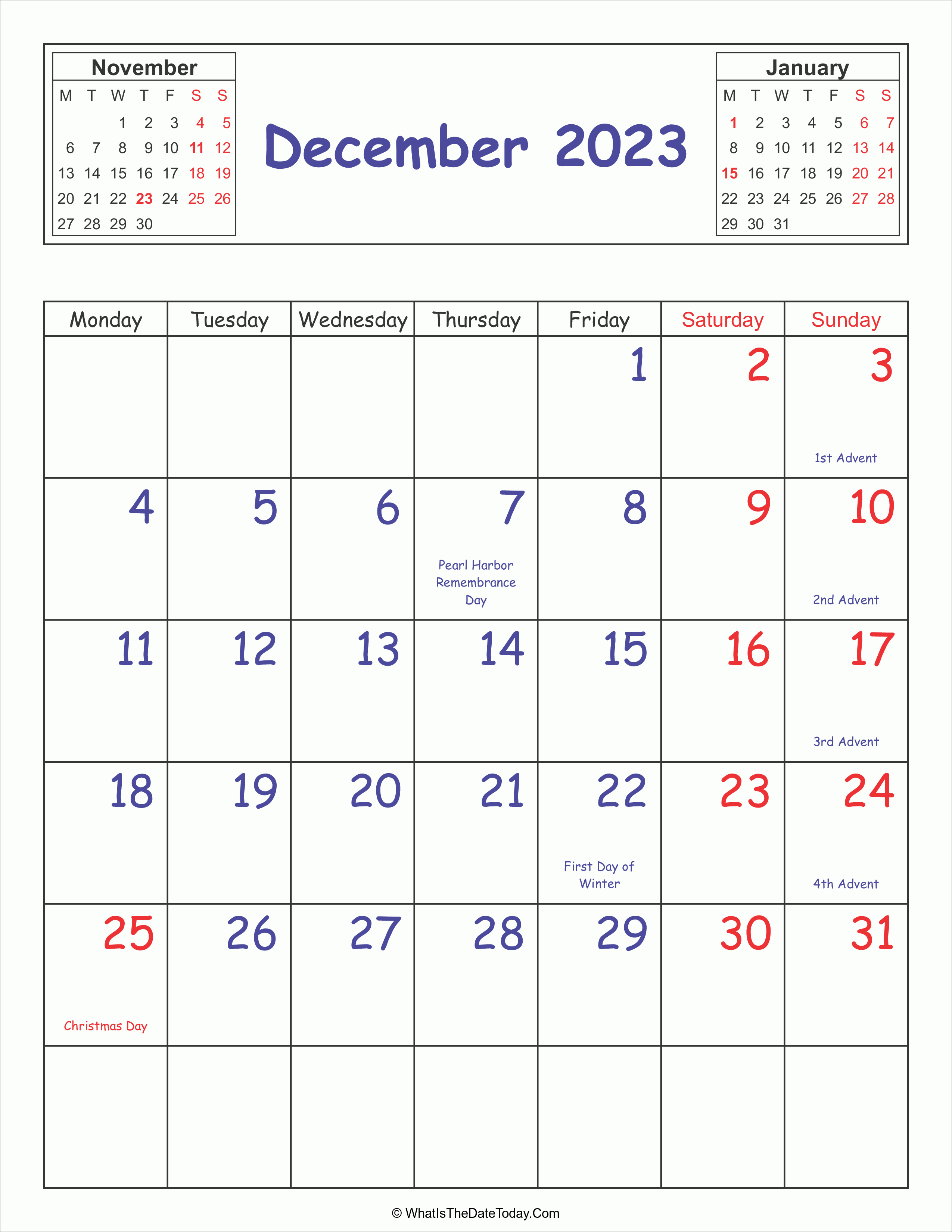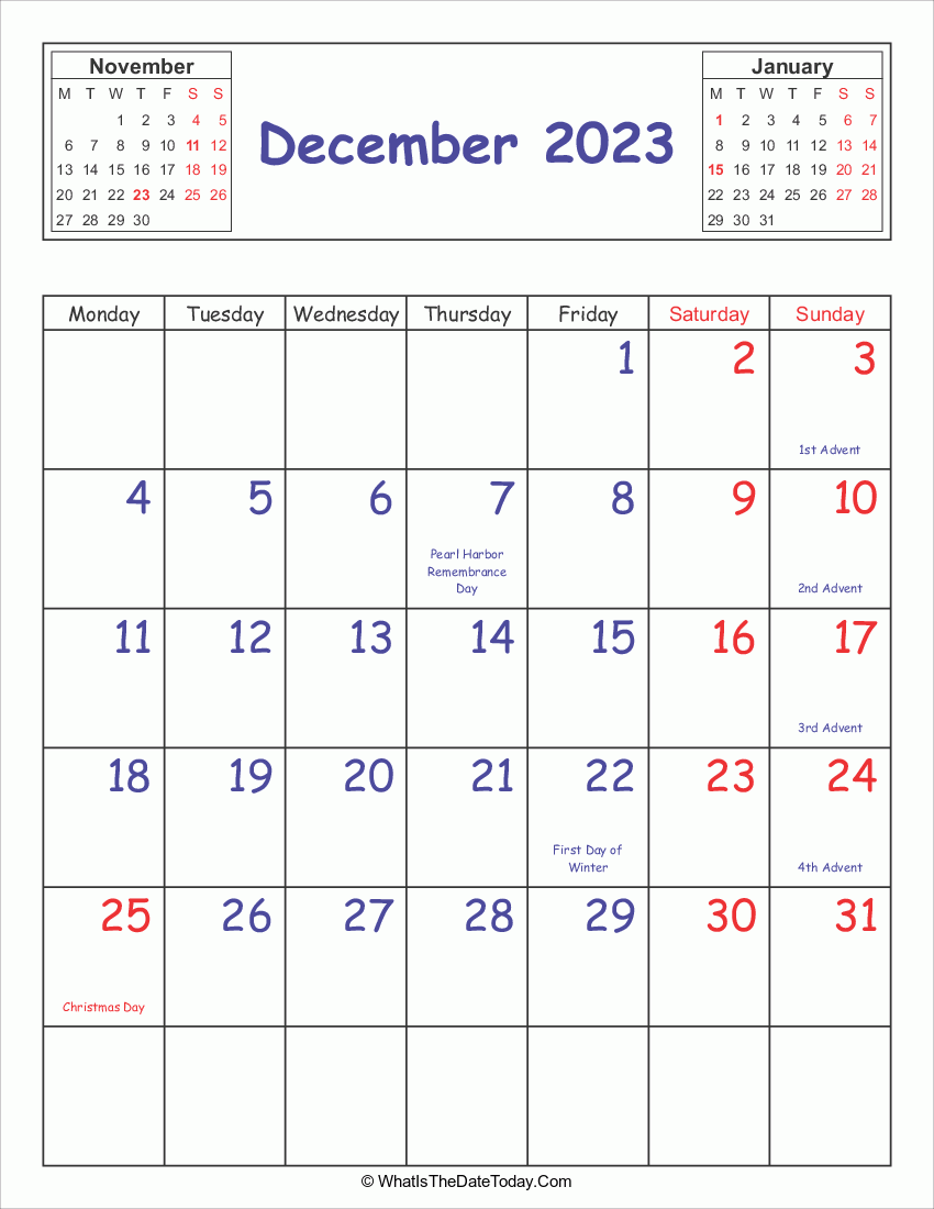 This Printable 2023 Calendar December (Vertical Layout) is a available for download in PNG format. The calendar come with colorful font in black, blue and red.