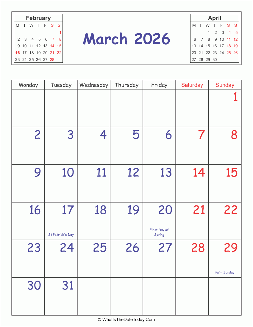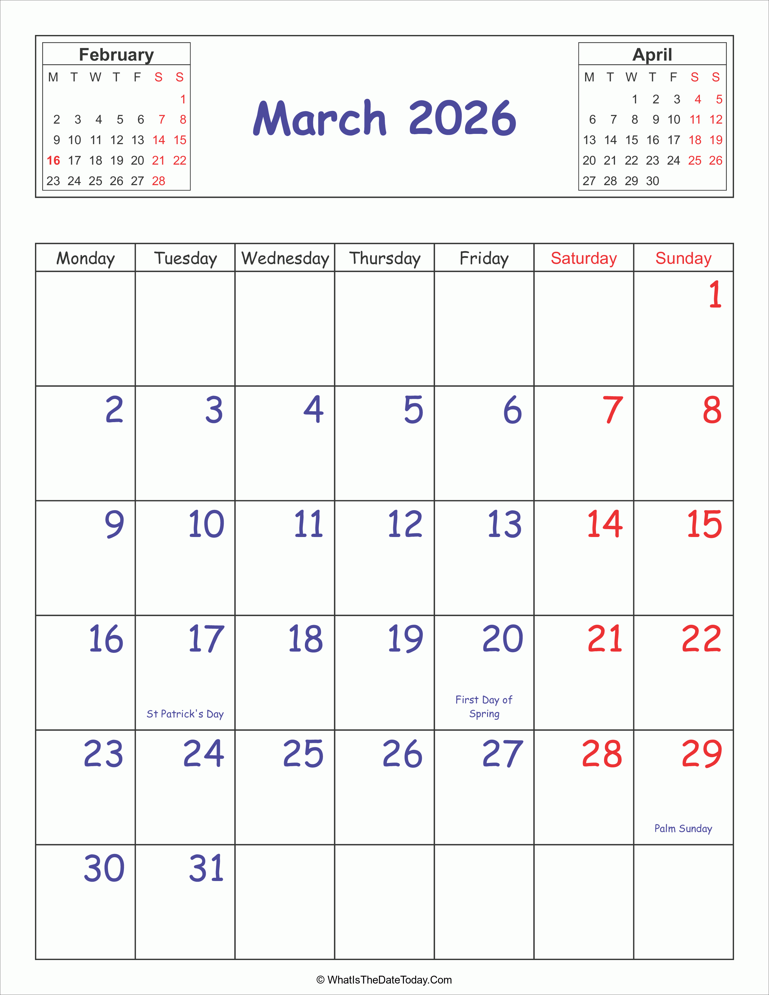 This Printable 2026 Calendar March (Vertical Layout) is a available for download in PNG format. The calendar come with colorful font in black, blue and red.