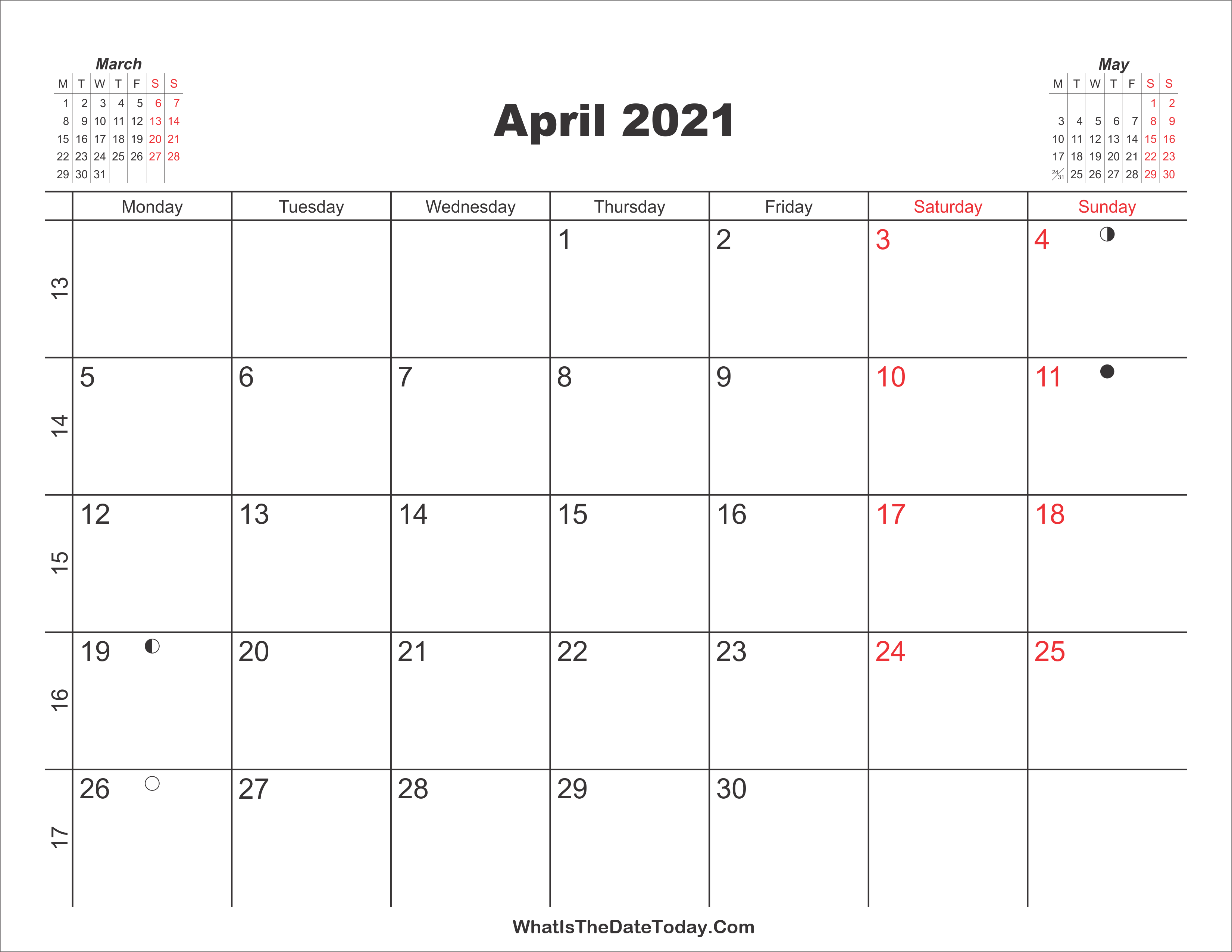 Printable Calendar April 2021 is a landscape calendar included moon phase, week number and two mini calendars at header. The calendar available for download and print in PNG format.