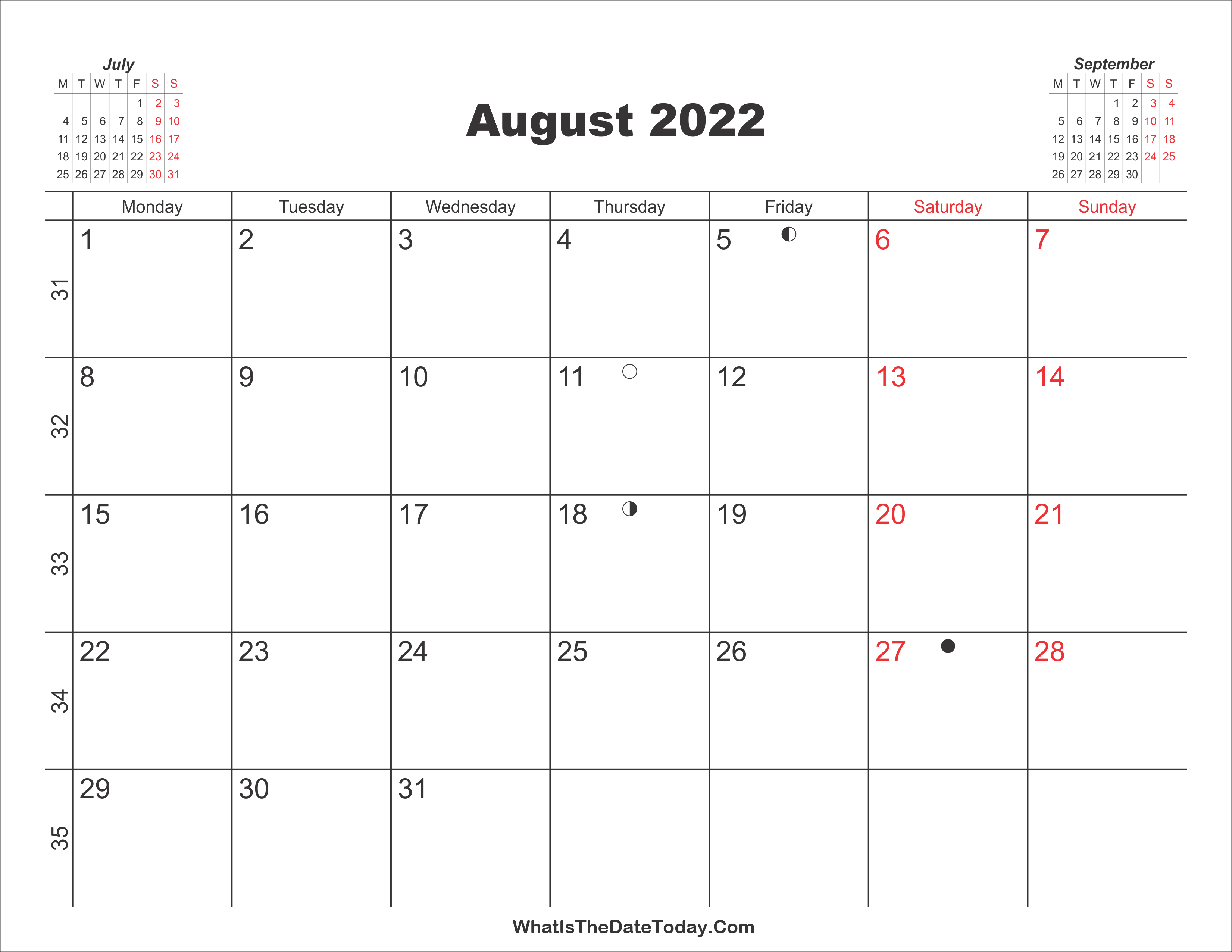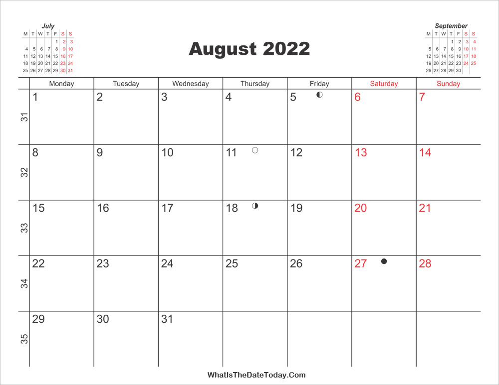 Printable Calendar August 2022 is a landscape calendar included moon phase, week number and two mini calendars at header. The calendar available for download and print in PNG format.