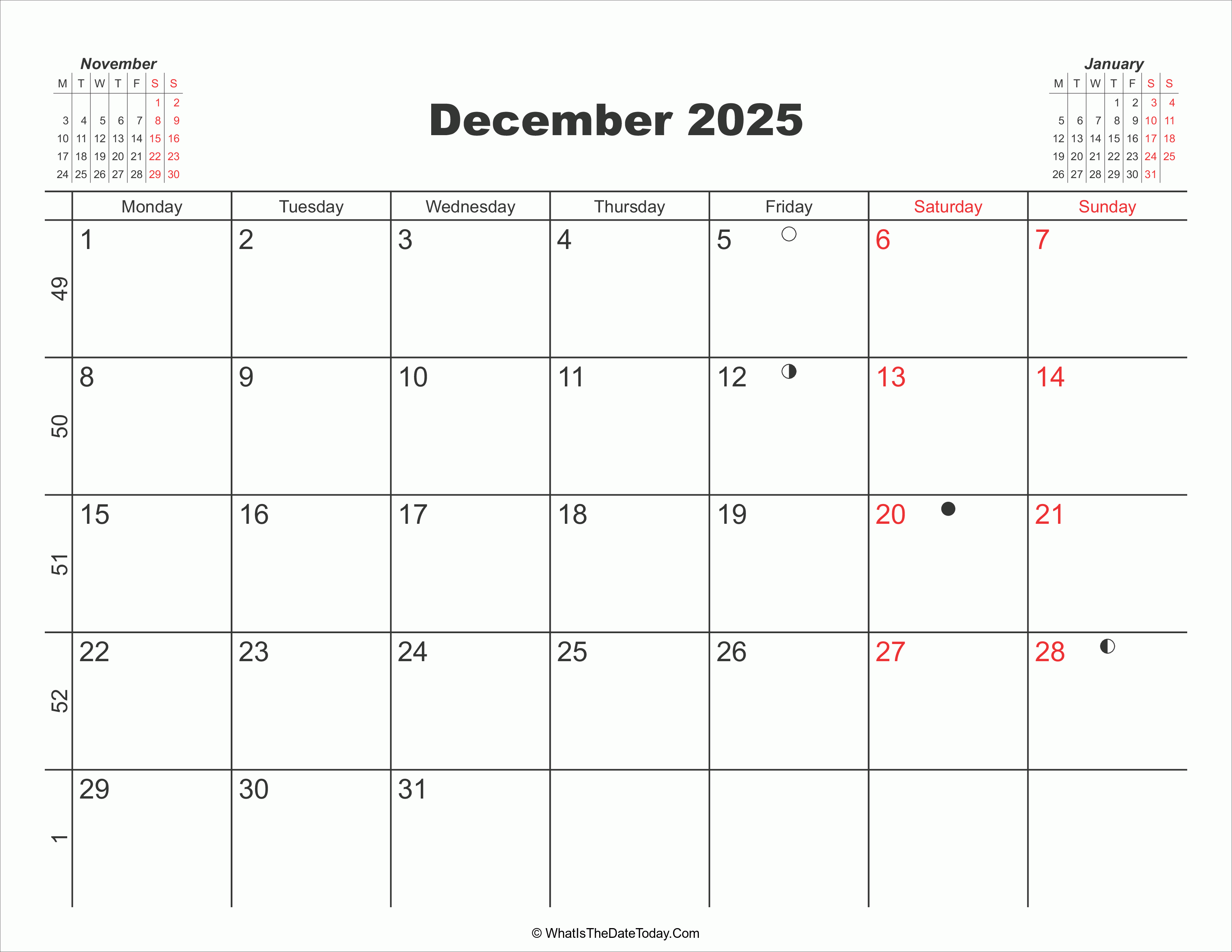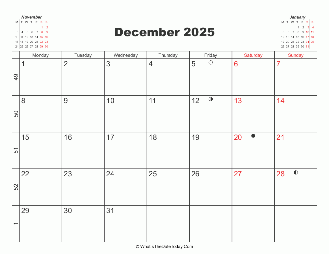 Printable Calendar December 2025 is a landscape calendar included moon phase, week number and two mini calendars at header. The calendar available for download and print in PNG format.