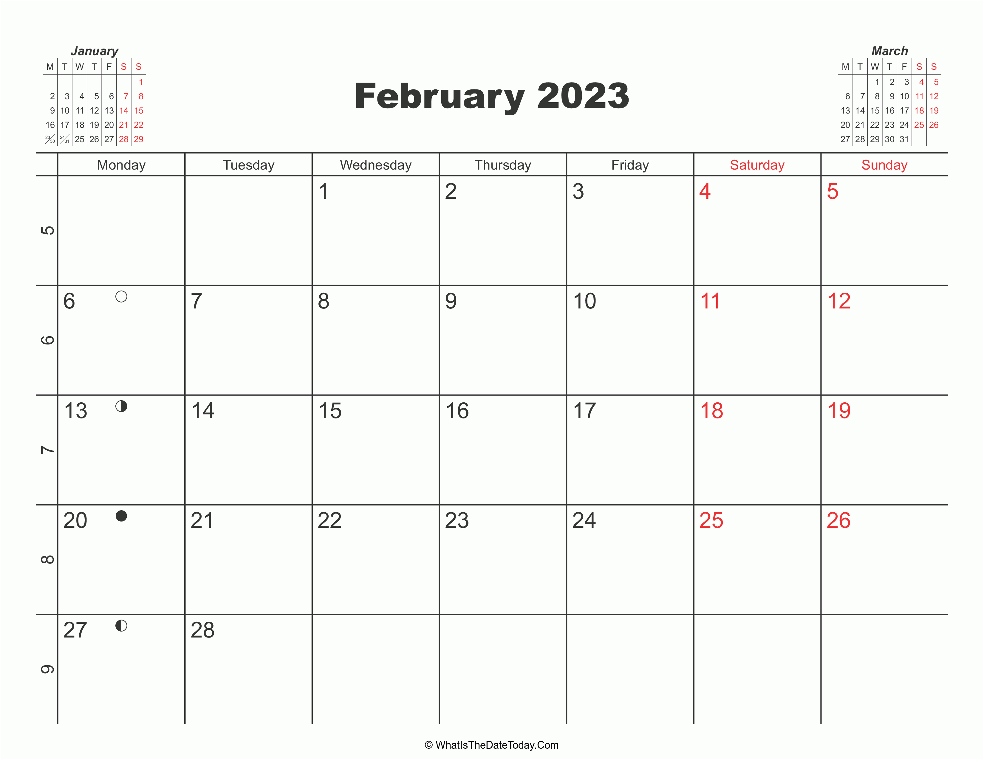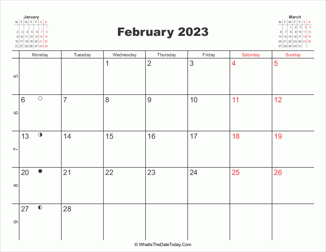 Printable Calendar February 2023 is a landscape calendar included moon phase, week number and two mini calendars at header. The calendar available for download and print in PNG format.