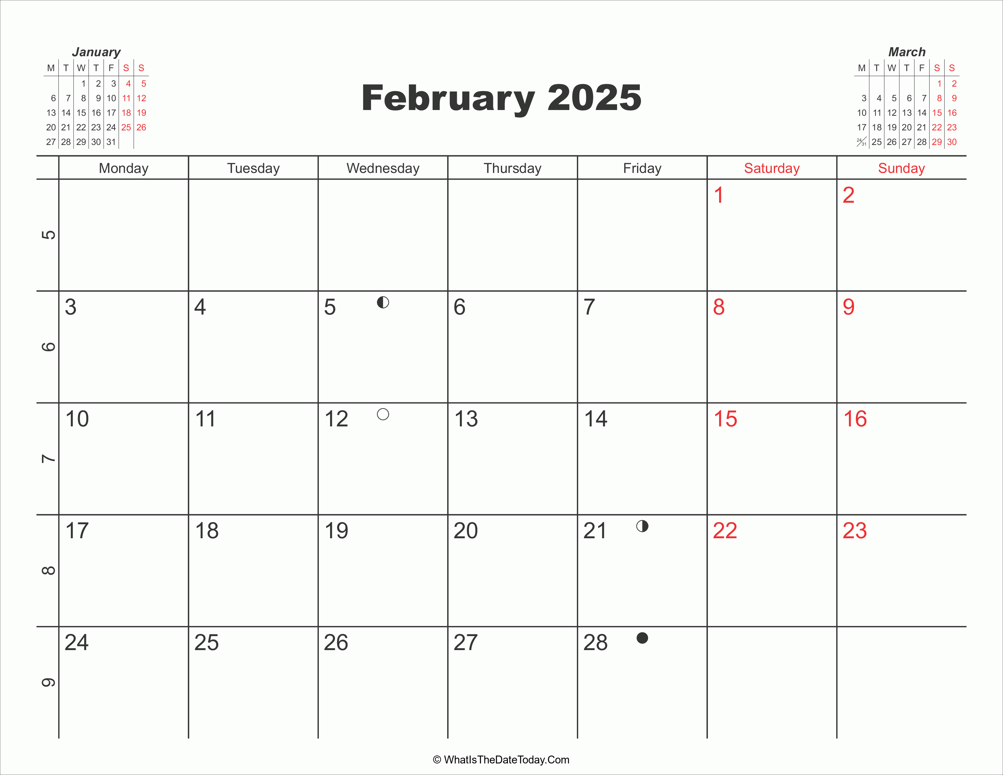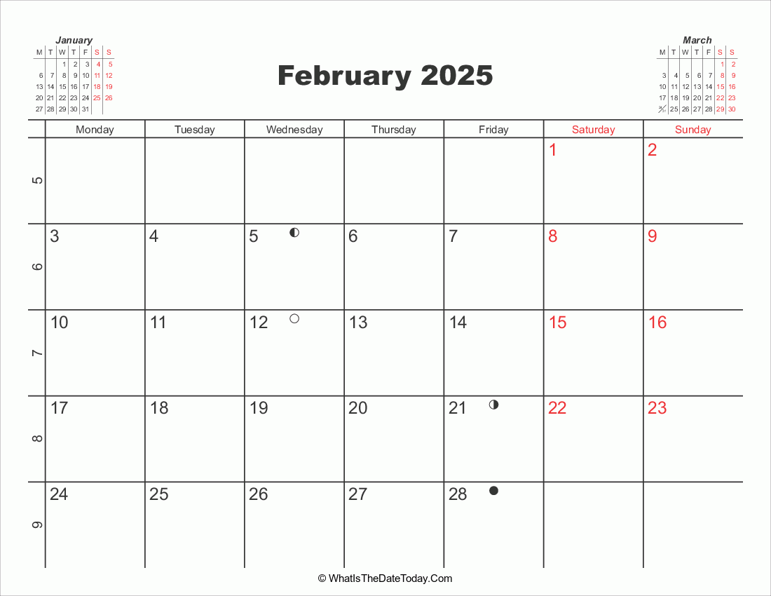 Printable Calendar February 2025 is a landscape calendar included moon phase, week number and two mini calendars at header. The calendar available for download and print in PNG format.