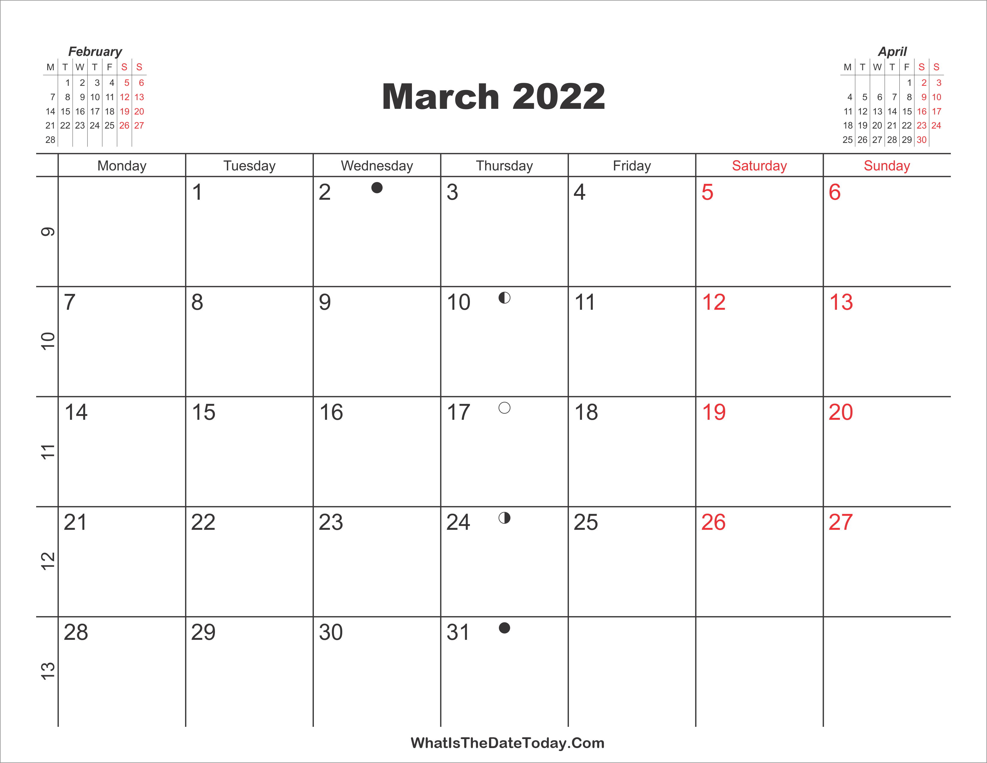 Printable Calendar March 2022 is a landscape calendar included moon phase, week number and two mini calendars at header. The calendar available for download and print in PNG format.