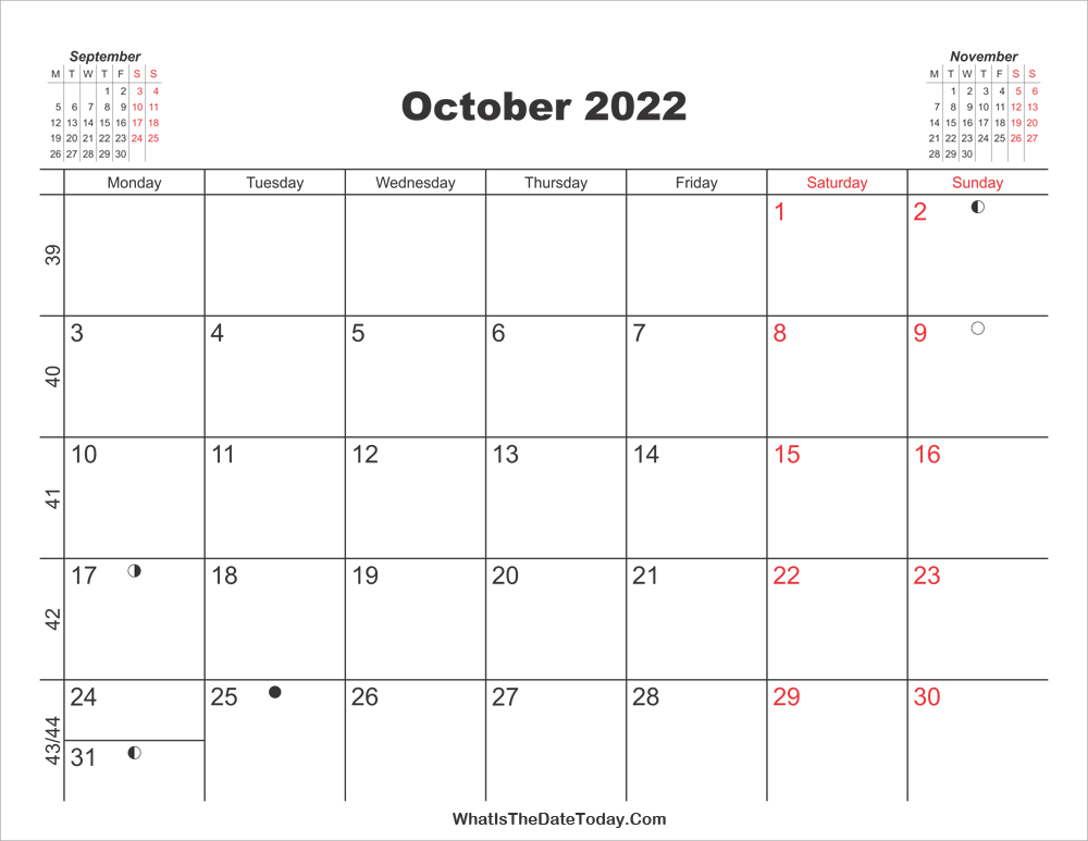 Printable Calendar October 2022 is a landscape calendar included moon phase, week number and two mini calendars at header. The calendar available for download and print in PNG format.