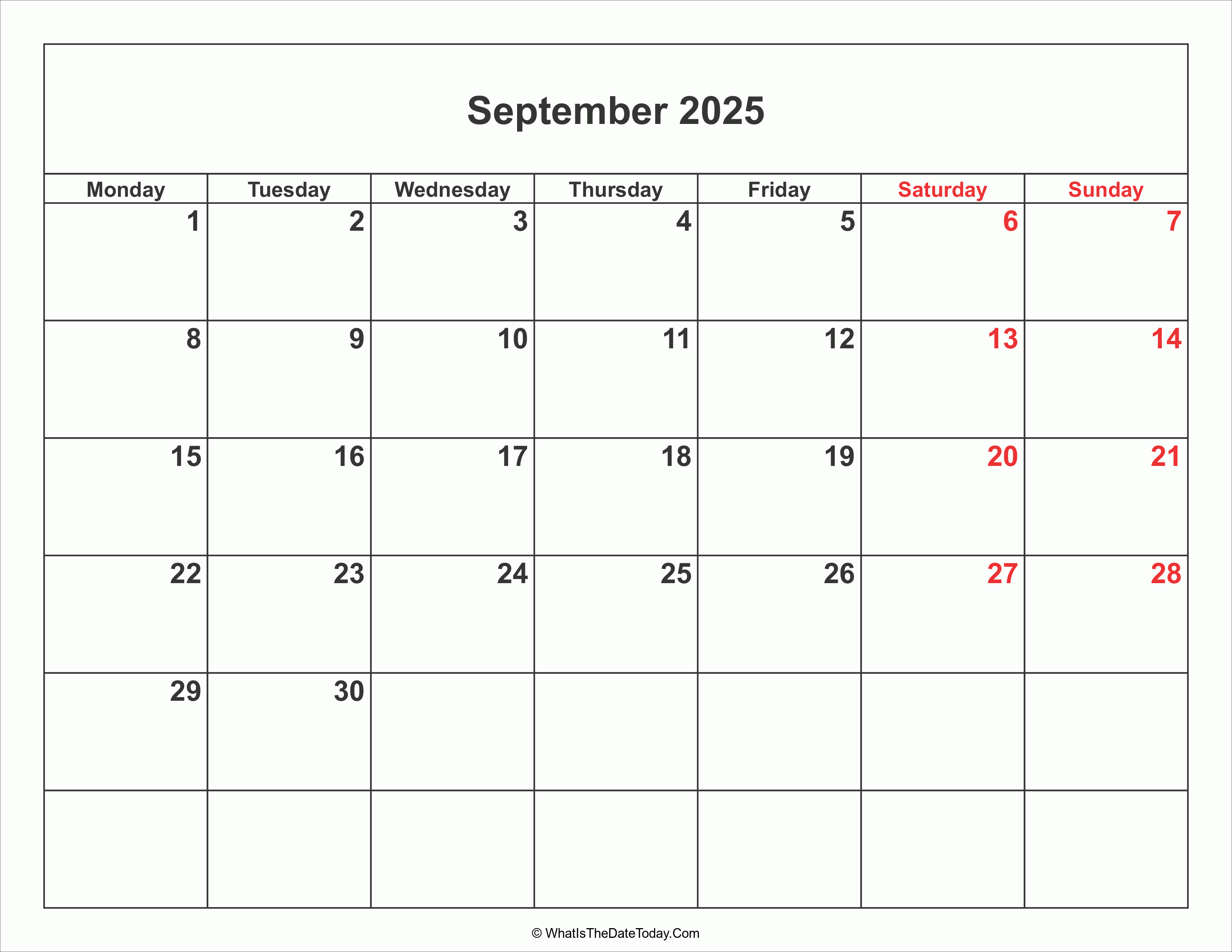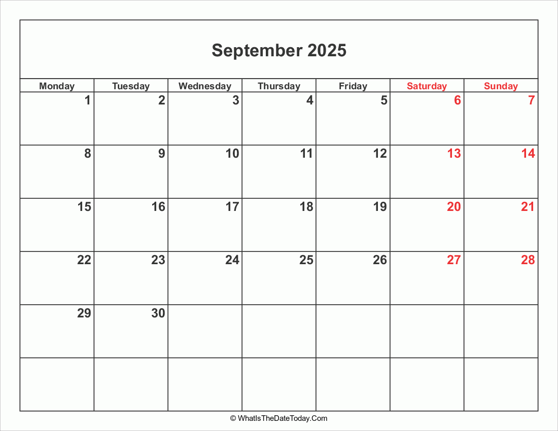 September 2025 Calendar with Weekend Highlight is a simple calendar with saturday and sunday columns highlight in red color. Free to download and print your monthly calendar 2025 now.